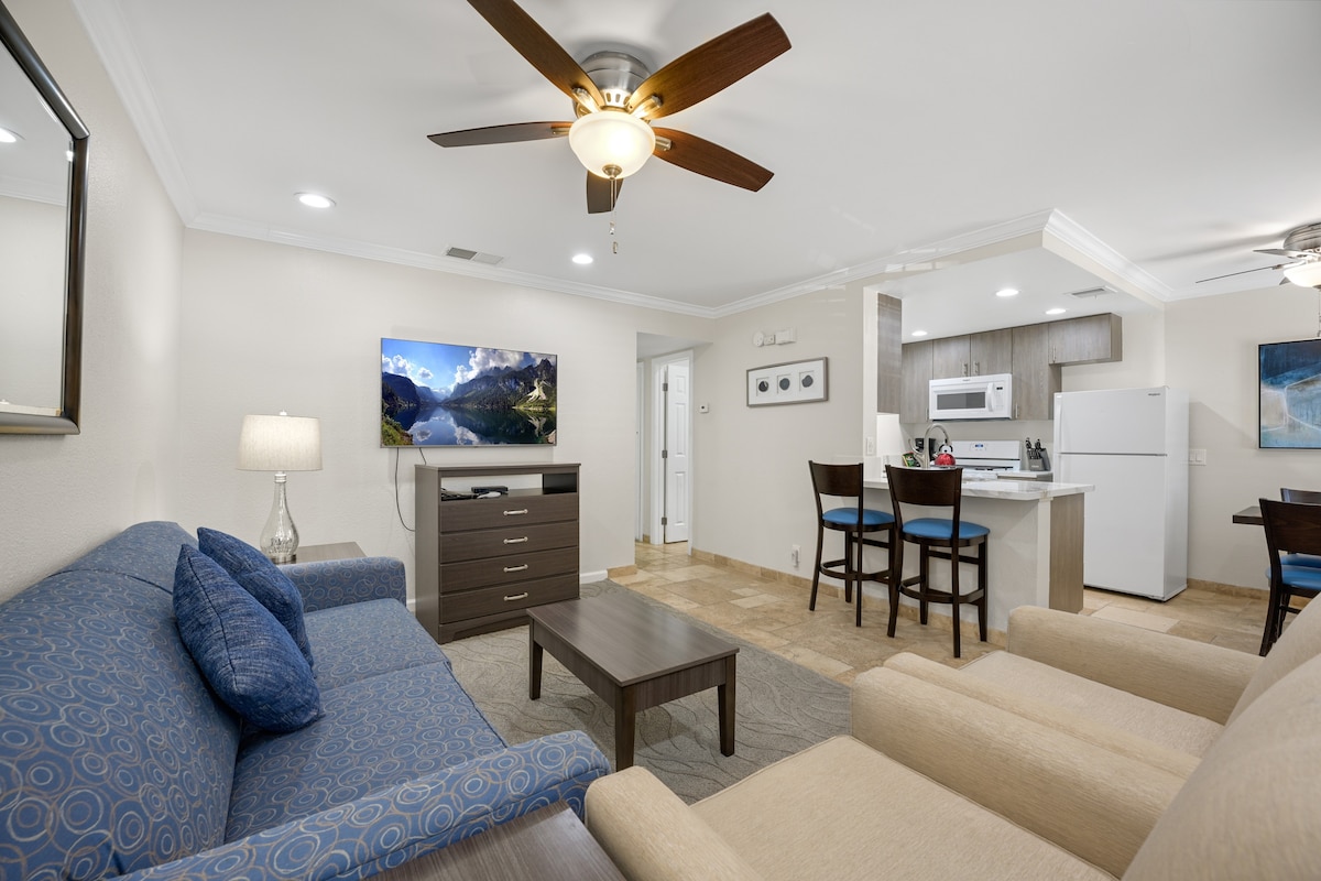 A full living room with a TV and sleeper Sofa for extra sleeping space if needed.