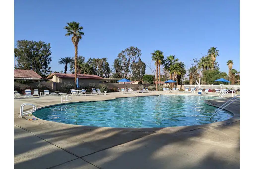 Located in Indian Palms CC which is just across the street from VIP parking, this 2-bed, 1-bath Coachella rental offers the perfect getaway. Enjoy a beautiful pool and spa area, a putting green, BBQs, fire pits, and a pool house with a kitchen and TV. Relax after the festival in this private, fully-equipped retreat with easy access to all the action. Your ultimate Coachella experience starts here!
