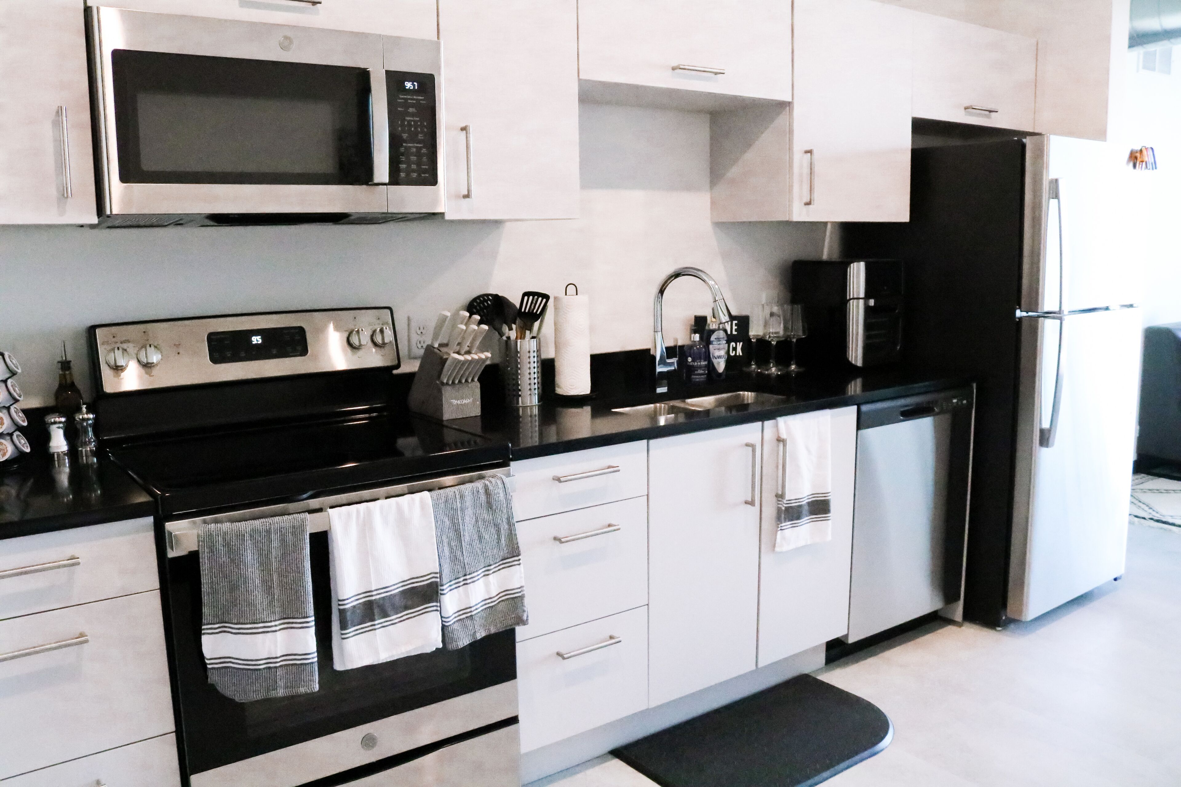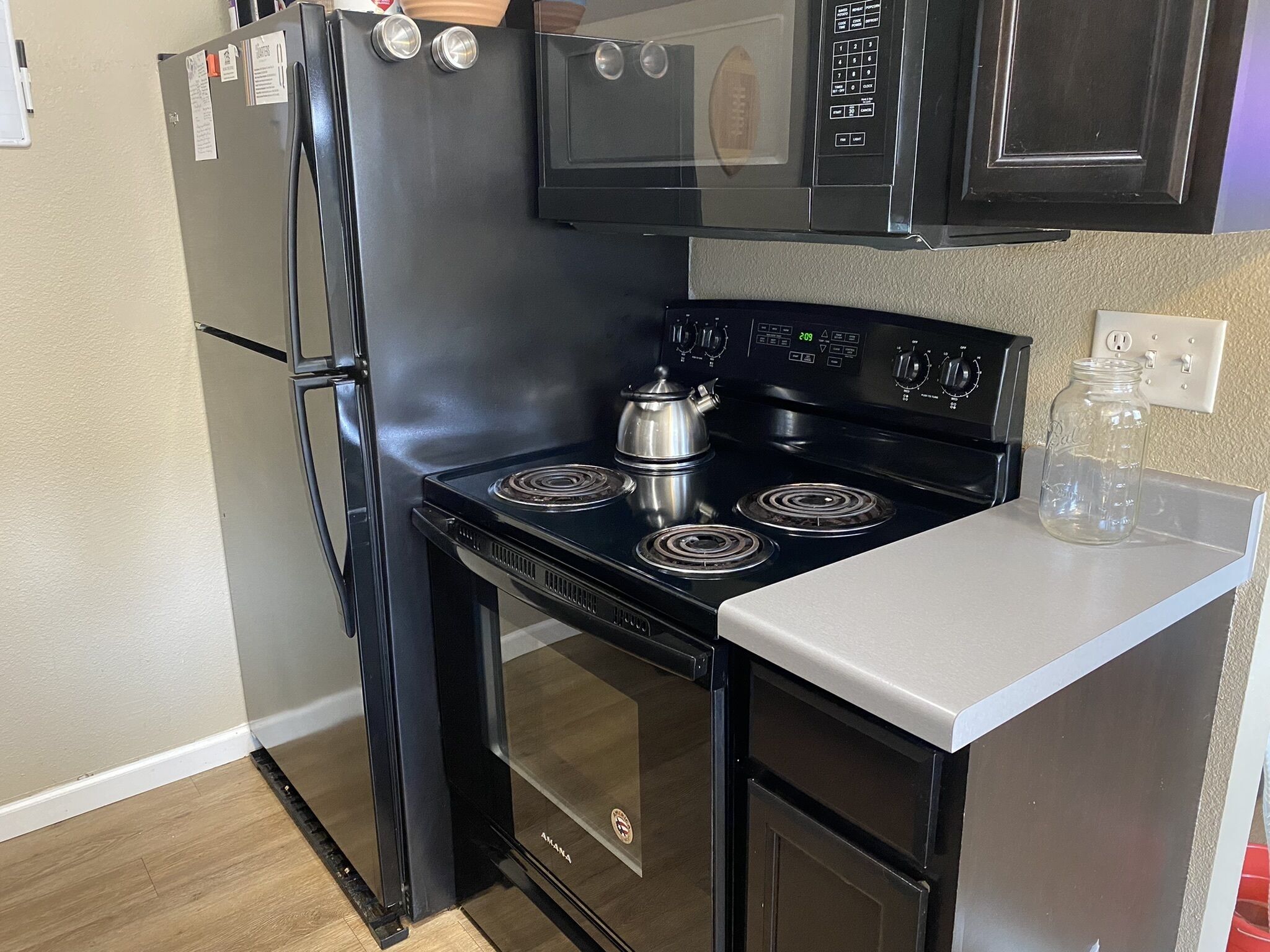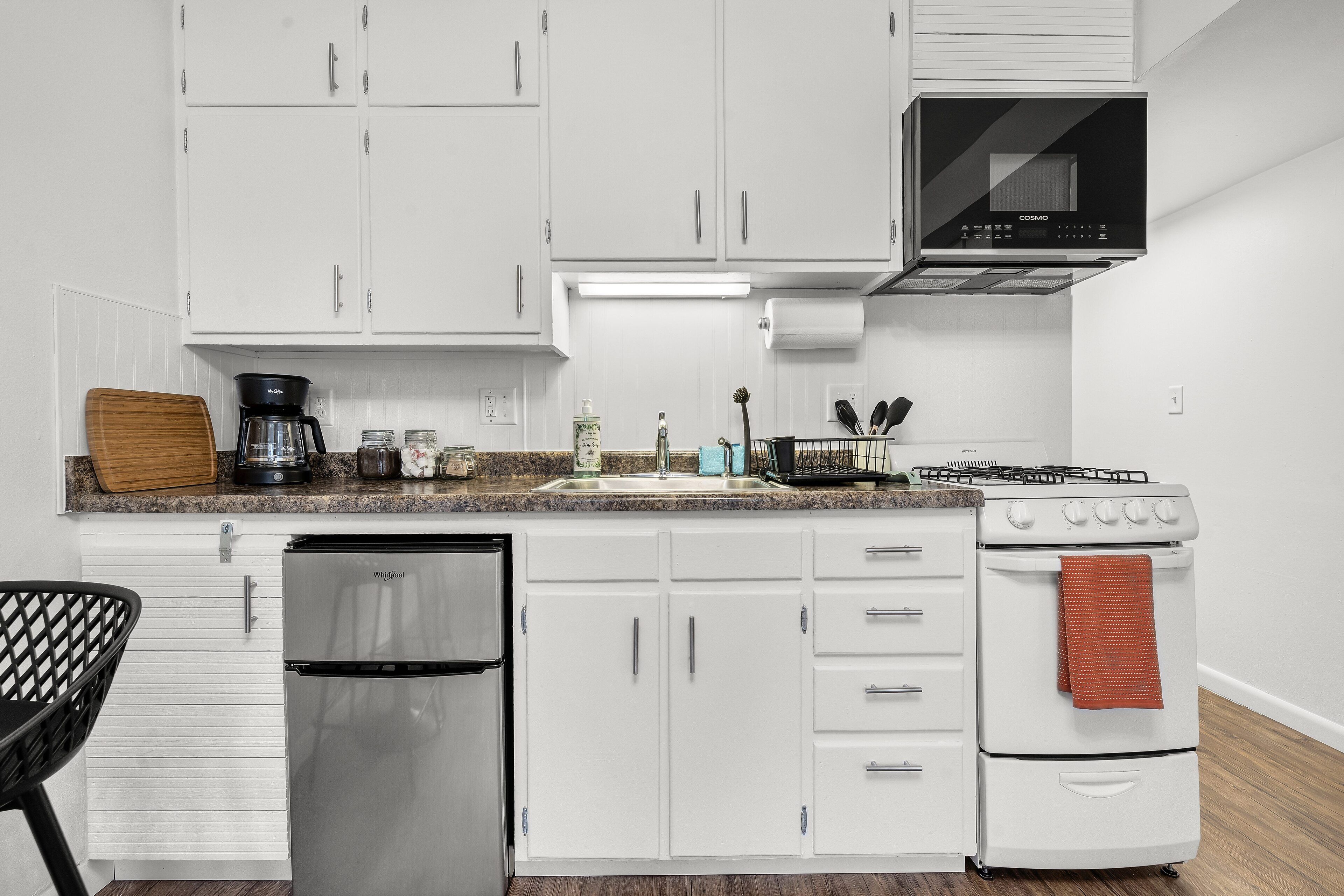 - Appliances: Oven, gas stovetop, microwave, refrigerator, toaster, coffee machine, electric kettle