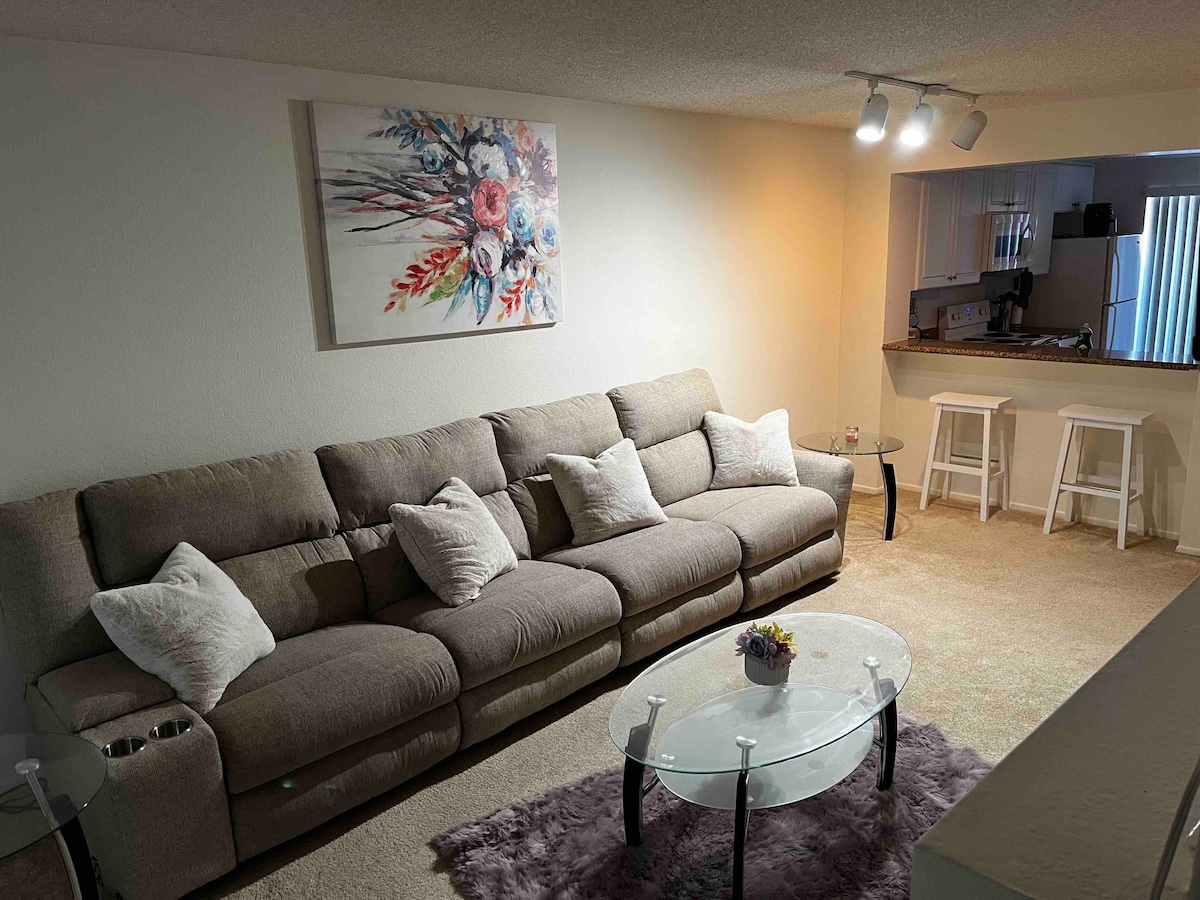 The apartment is located on 4th floor Wich is the top floor close to the gym and the pool just right downstairs. Very clean cozy living space one bedroom with queen size Memory Foam bed in the bedroom sleeps two comfortably and queen size sofa sleeper sleeps two comfortably. Upstairs in the loft area you will find a desk and twin size bed for guests !