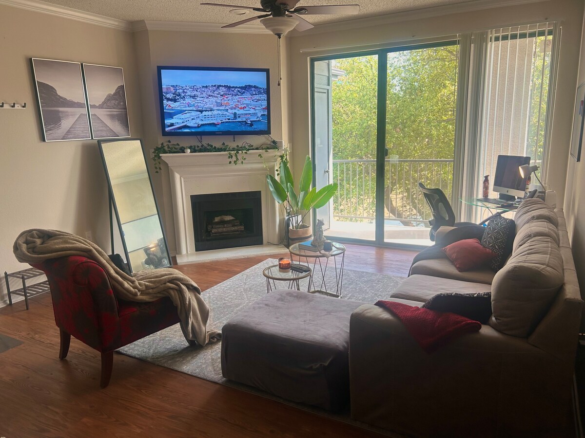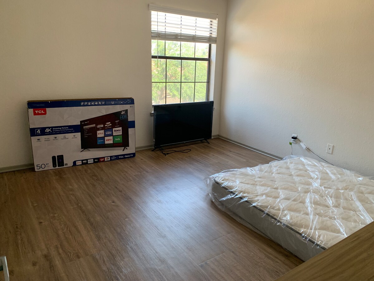 The bedroom is furnished with a spacious King-size bed and a TV, offering ample storage space and shelves. The kitchen has been completely upgraded and features a modern stainless steel appliance set with a side-by-side refrigerator. The living room is equipped with a large 50-inch TV, and there's also a dedicated desk setup in the living area for added convenience.