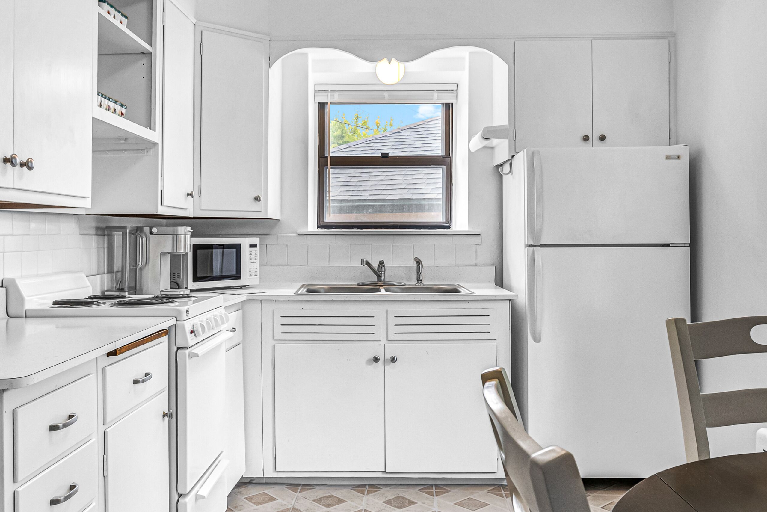 The fully equipped, early Americana-style chef’s kitchen has original wood cabinets and woodworking, vintage formica countertops, large windows and retro-style linoleum tile floors. The eat-in area has a small dinette with seating for three, beside a large window with views of the lush, historic neighborhood.