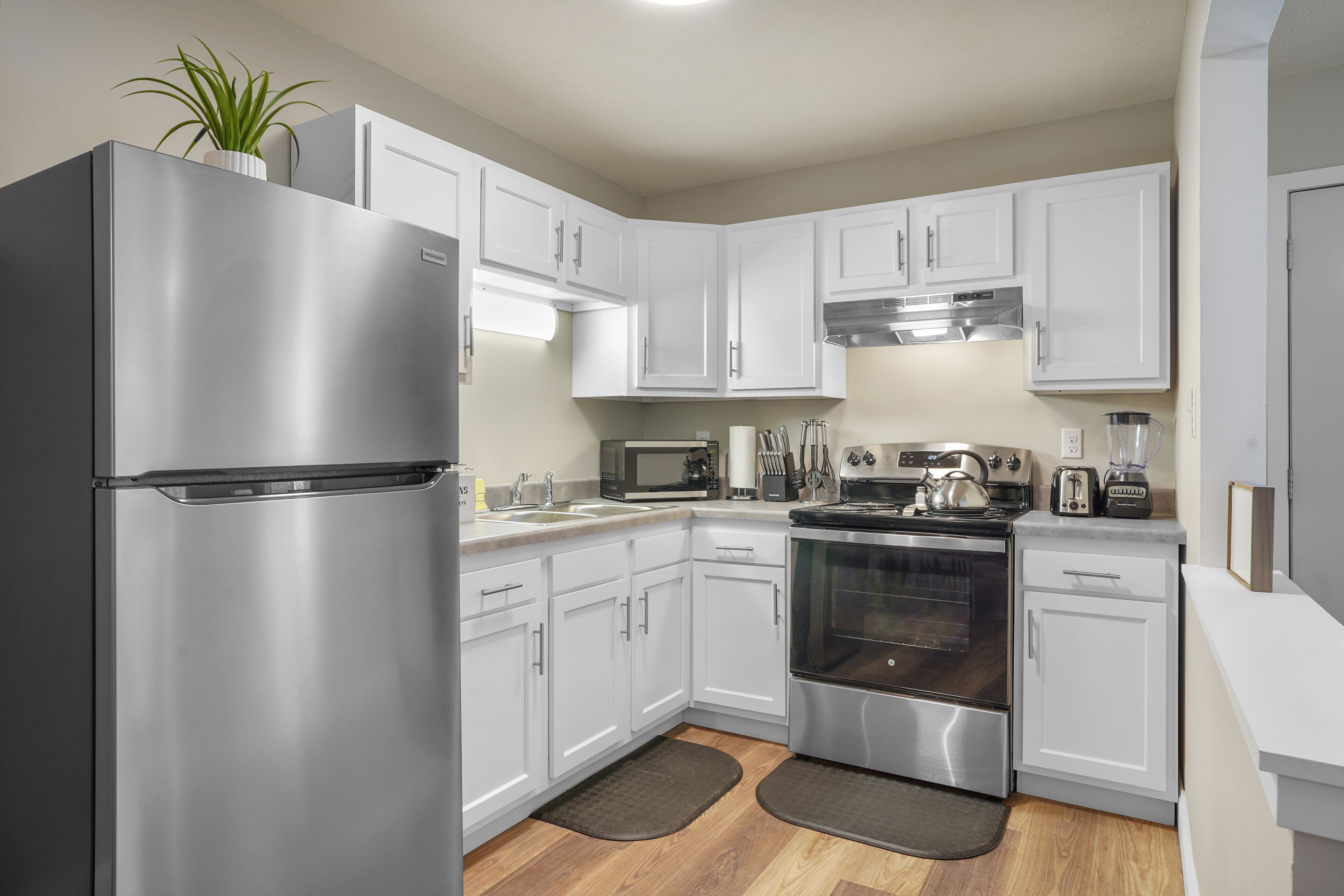 Discover culinary delights in the fully-equipped kitchen showcasing brand new stainless steel appliances, including a stove & single oven, microwave, and full-sized fridge allowing you to whip up delicious meals during your stay. Small appliances such as a toaster, Keurig coffee machine, hot water kettle and blender are provided to entertain your culinary adventures. Complimentary coffee, creamer & tea are always provided for you! Pantry items provided include the essentials: salt, pepper, sugar and oil.
