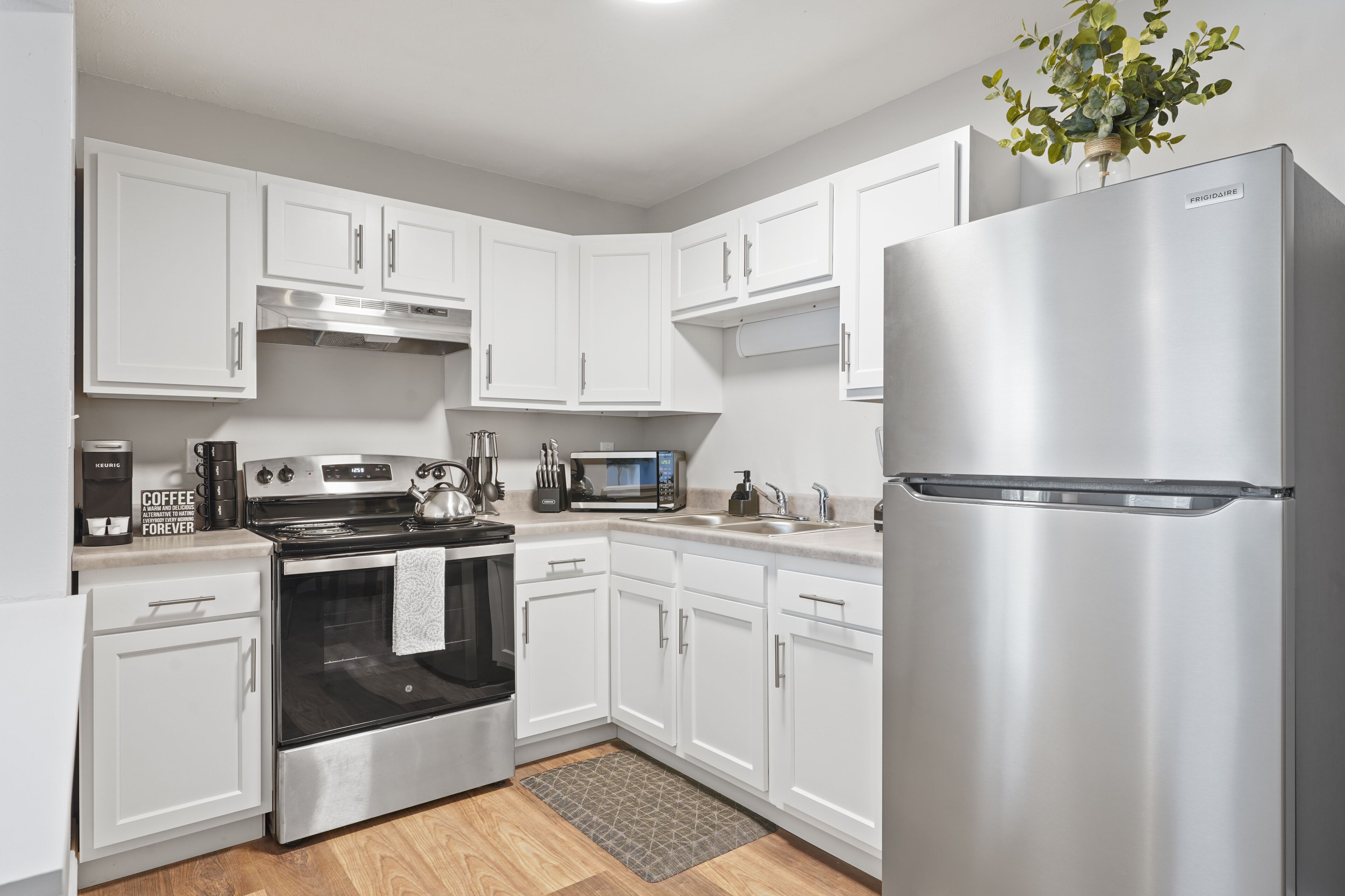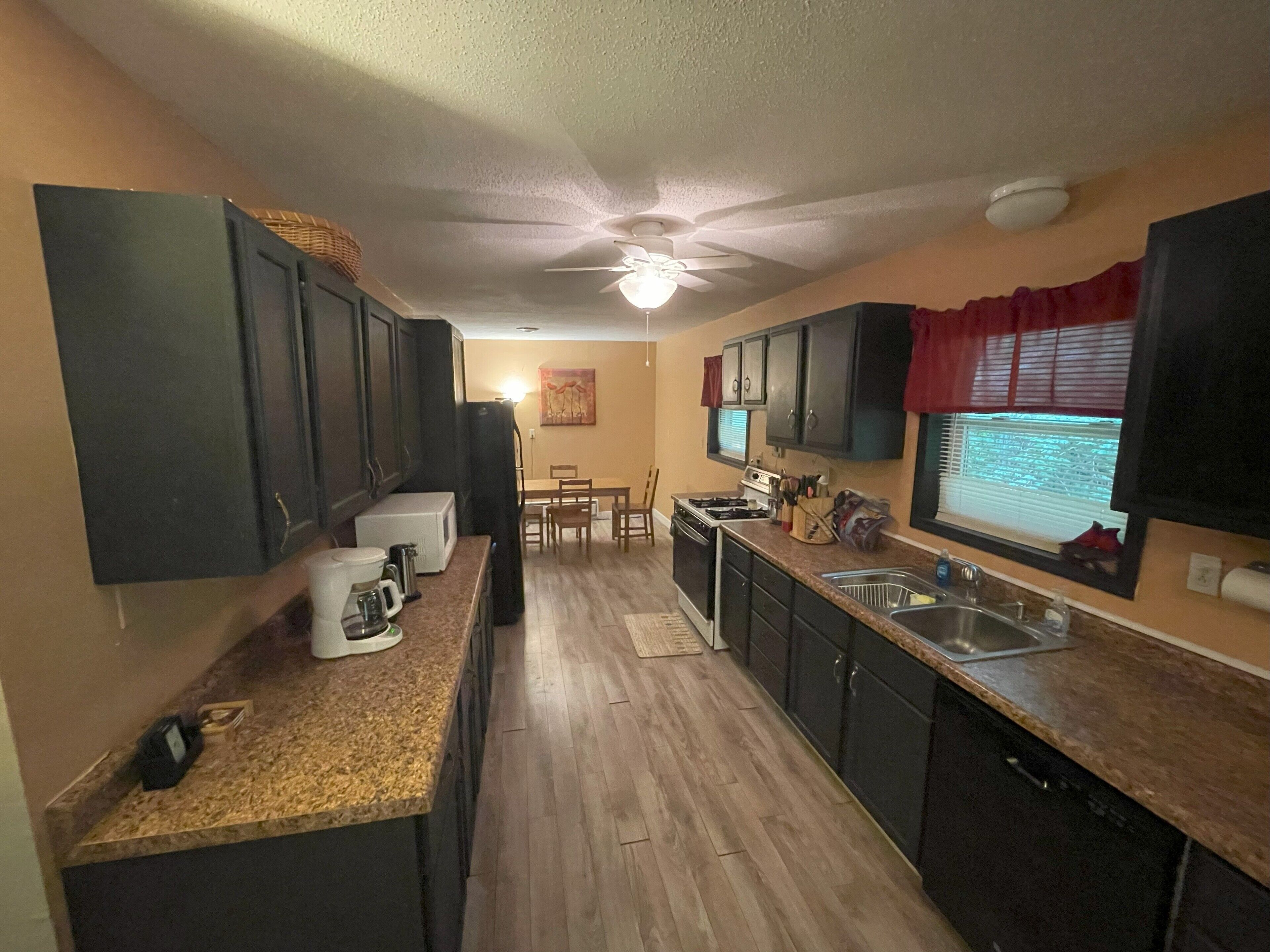 The fully stocked kitchen features brand-new appliances, including a full-size fridge, stove/oven, and microwave, plus small appliances like a Keurig, hot water kettle, toaster, and blender. Complimentary coffee and creamer are always provided. The charming dining nook with seating for two is perfect for a quiet meal or morning coffee. (Note: No dishwasher at this location.)