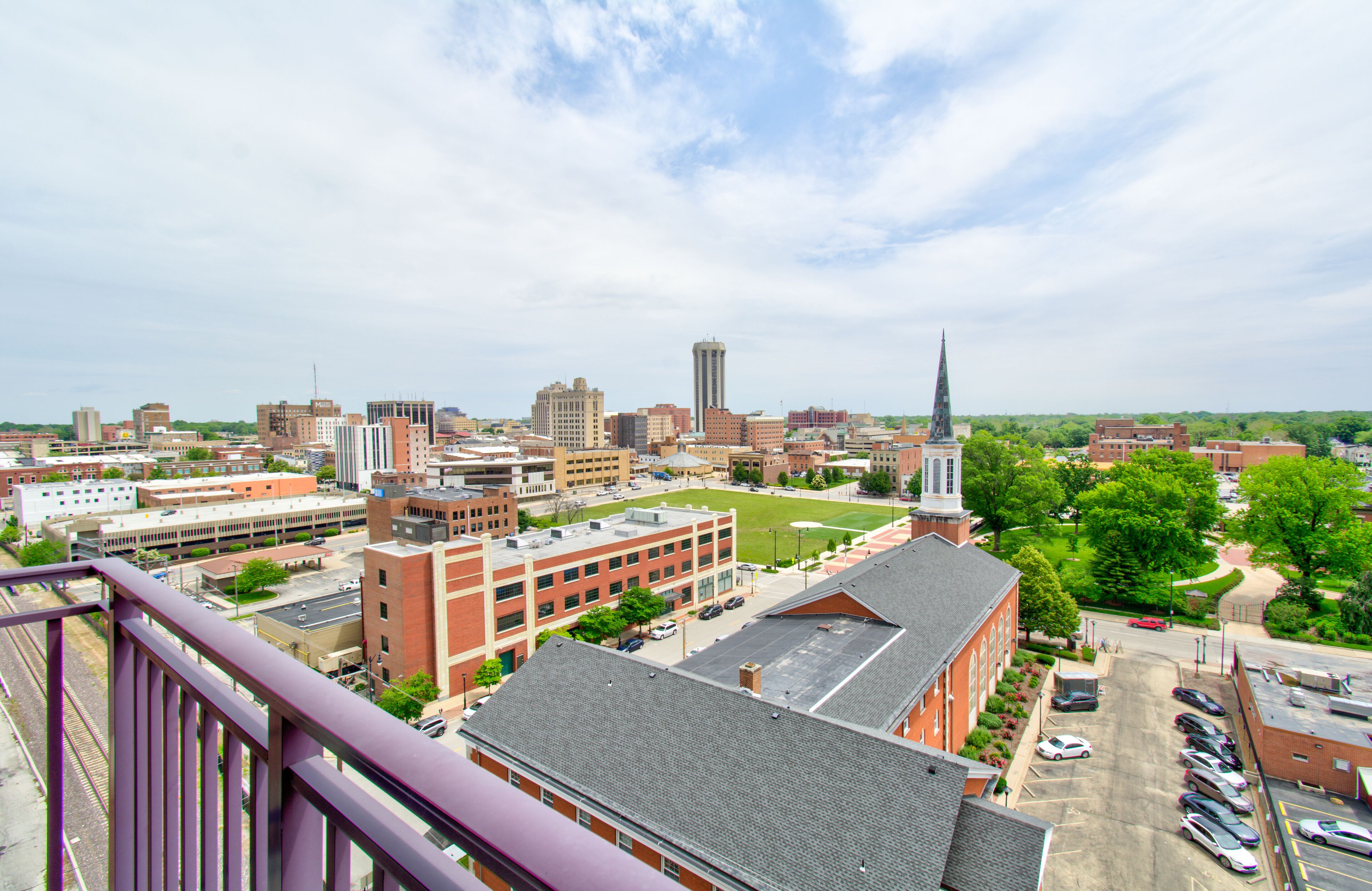 CORPORATE HOUSING: Beautifully curated one-bedroom apartment in the heart of Downtown Springfield features a full-kitchen, & a balcony that boasts an unforgettable 11th floor view of the light art display at the Governor's Mansion at night!