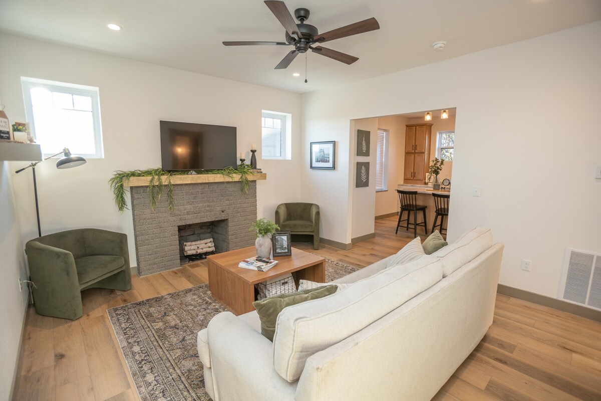 Original wood floors refurbished throughout; tile kitchen and bathroom. Pull-out couch in living room. Electric fireplace in living room. Extra sheets and blankets in cedar chest in dining room. Full kitchen with both coffee maker and Kuerig, supplies for both provided. Bottled water and ice maker. King size bed, dresser, and closet for convenience. En Suite has modern barn door. This space is very cozy and comfortable.