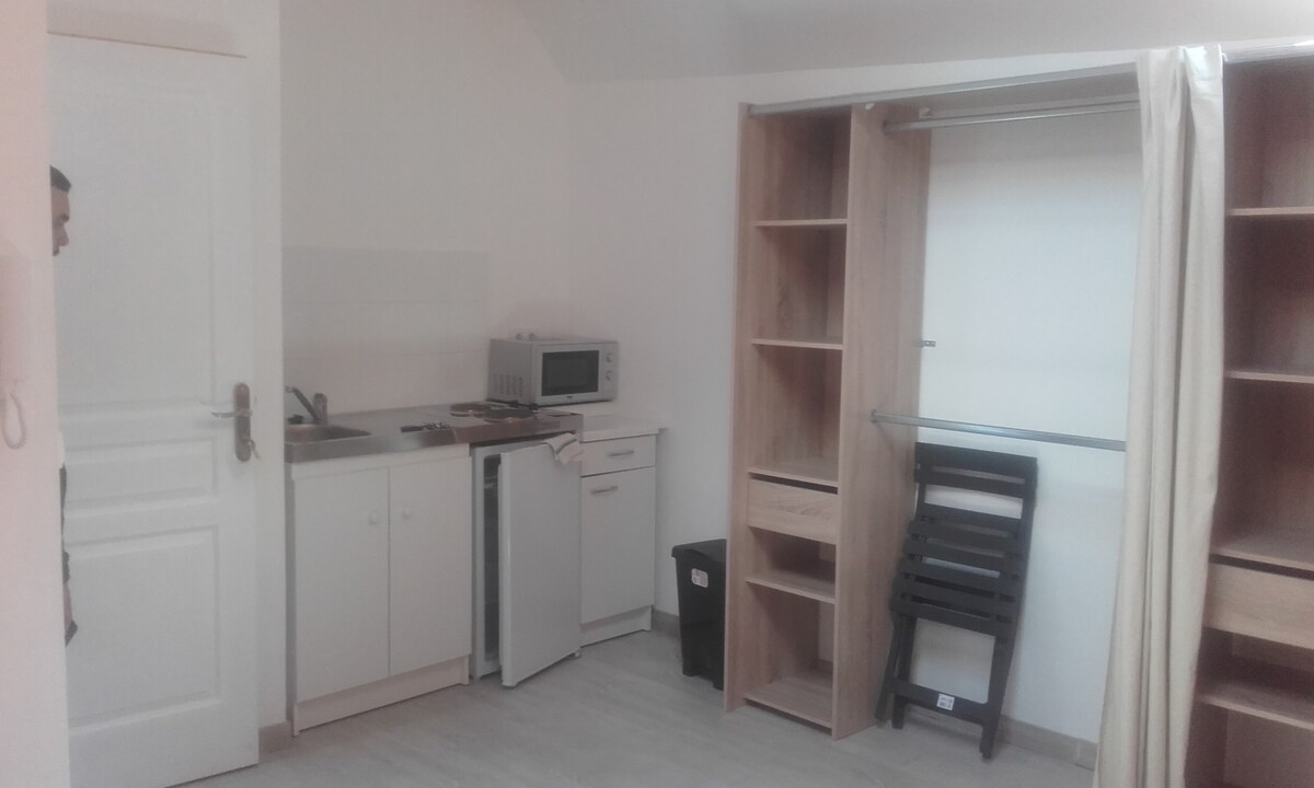 The bedroom comes with a kitchenette (hotplate + fridge + microwave) + a 160 bed + a desk + 2 chairs + shelves and a wardrobe + a small round table.