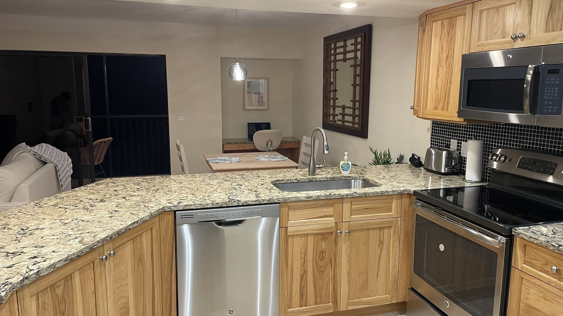 The fully equipped kitchen is perfect for preparing meals and includes modern appliances and a dining area with seating for four.