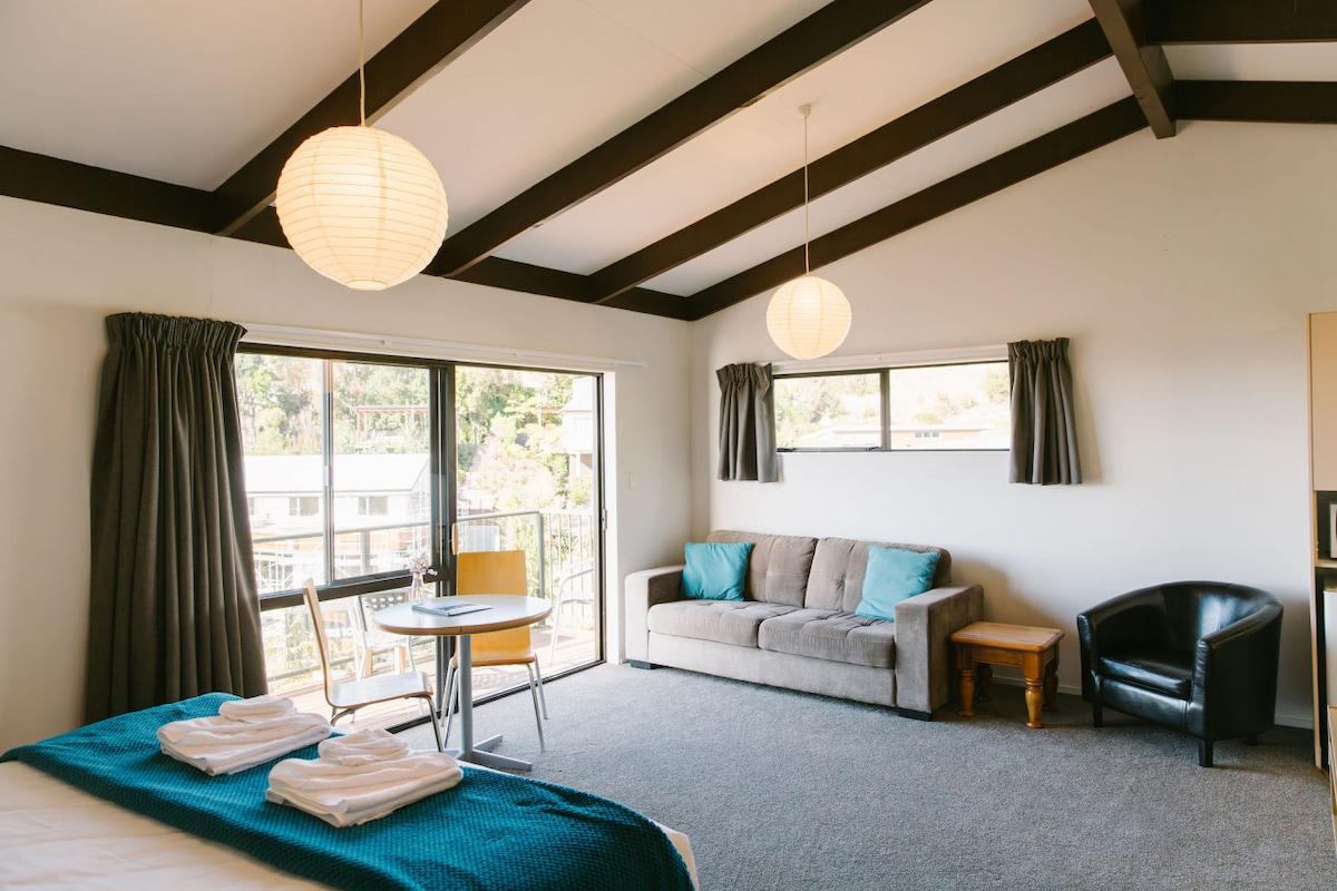 These Apartments have a spacious separate living area with dining room table and chairs, lounge area and have a balcony with views of Little Kaiteriteri beach and sea views .