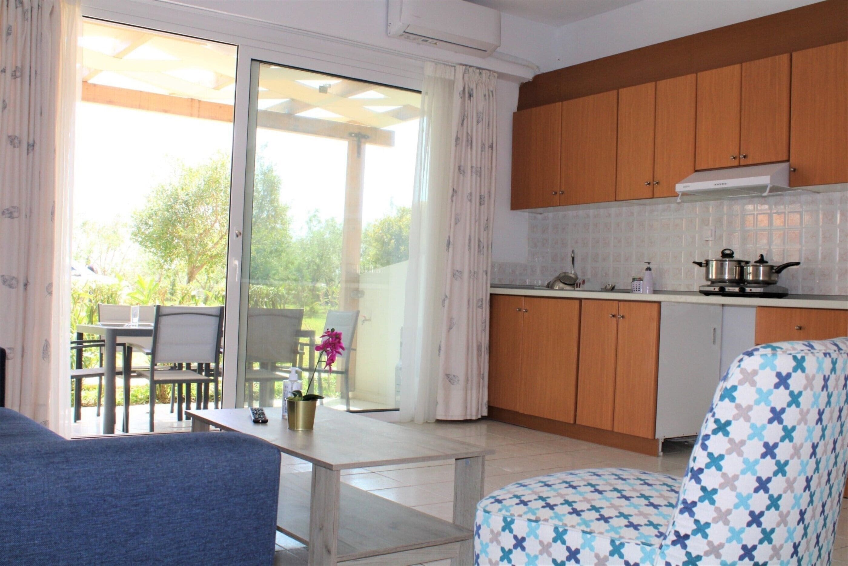 Aircondition, Wifi and TV Stylish interior decoration. Private veranda with a pergola and sitting area overlooking the olive garden for sunbathing and games. Just a few steps away you will find a number of bars restaurants shops pharmacy super markets tourist offices.