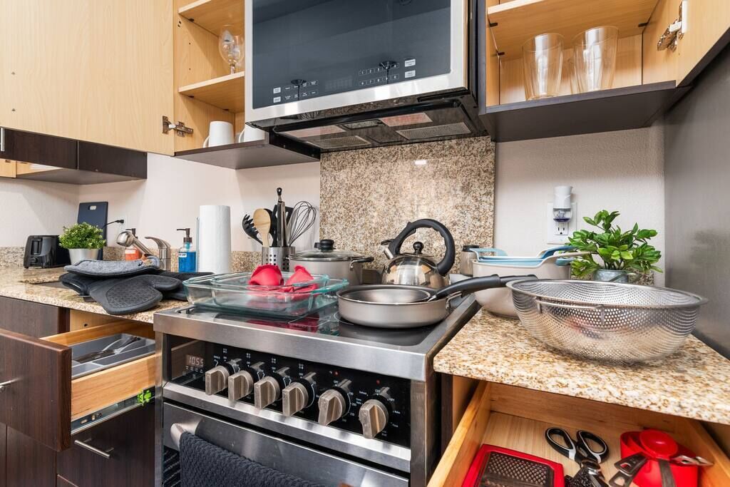 The kitchen has everything you need to cook: pans, baking sheets, dishes, and utensils. Standard pantry staples such as sugar, flour, oil, and more will be available.