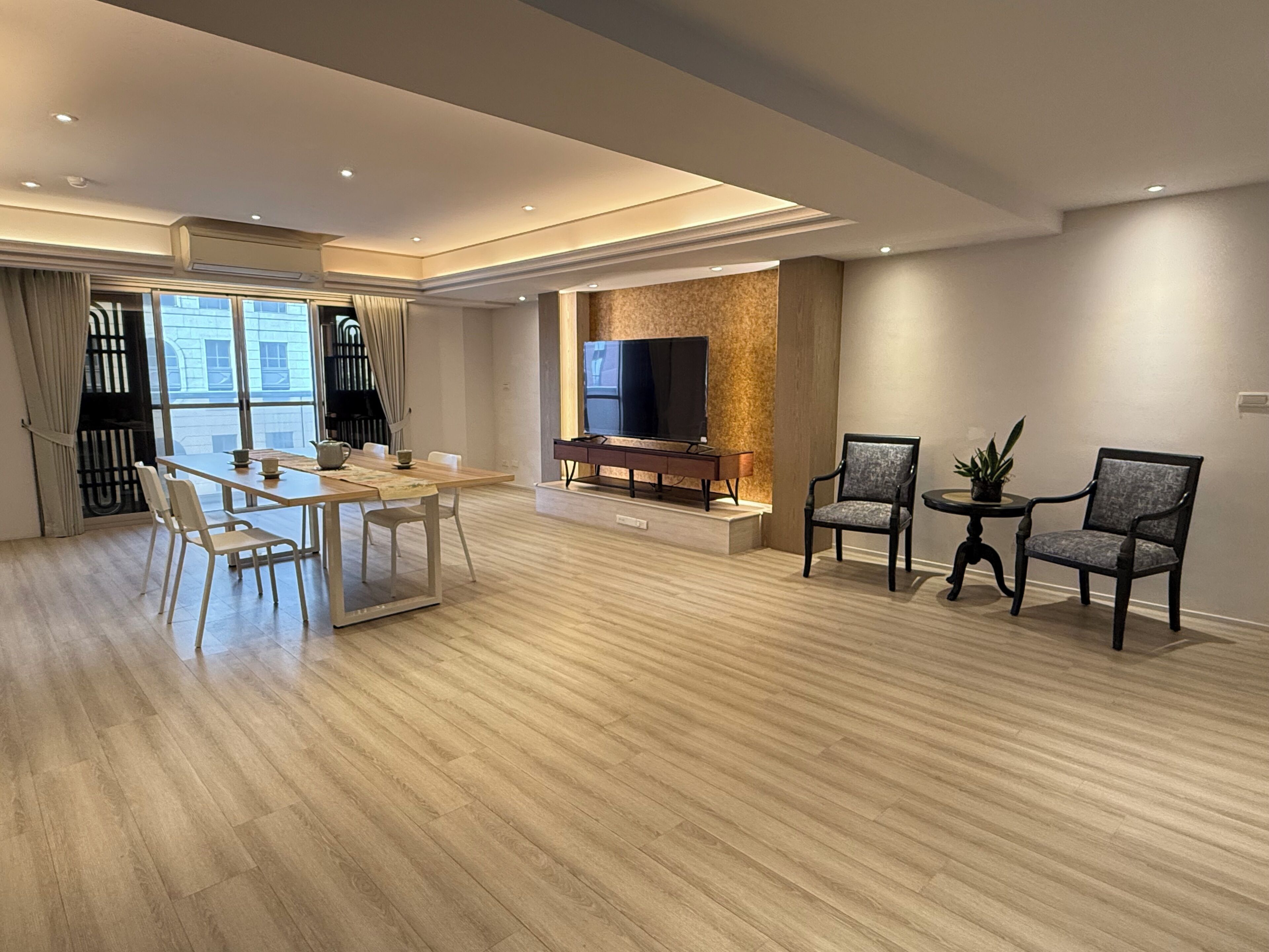一張大桌子、三張椅子、兩沙發