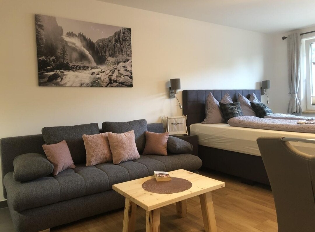 Modern and cozy studio in the 4 seasons-holiday-area of Kaprun - Zell am See! The deluxe studio Kaprun is located near the town center of Kaprun, only a few minutes of walking distance to shops, restaurants and bars. The ski bus stops approx. 100 m from the apartment house. Nice view from the balcony.
