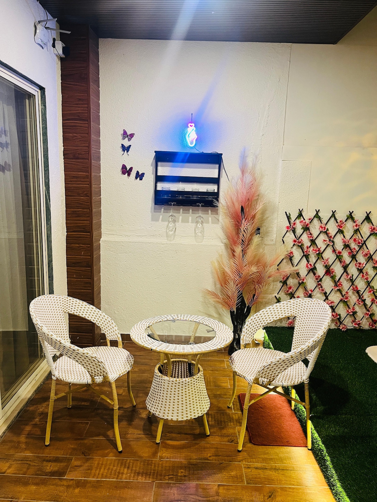 -The running patio connects living room with bedroom and has breathtaking view. You can relax on the coffee table and bar counter provided.