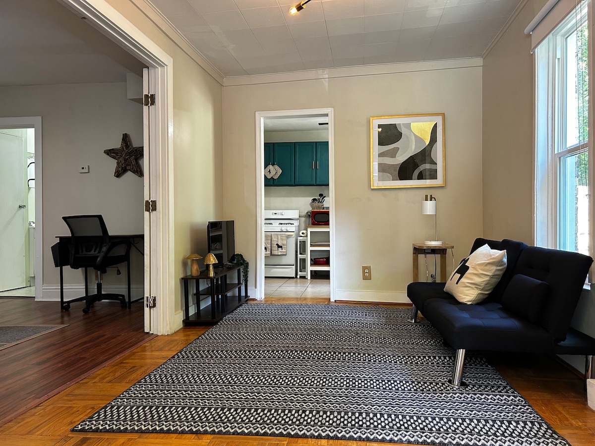 I used to rent this unit by the night, but since the time of the pandemic, it makes more sense to rent to those with longer term needs. This apartment is connected to the upstairs - there is a door in the unit at the top of the stairs leading to the rest of the house. This unit, though very sunny and nice, is in the basement of the home.