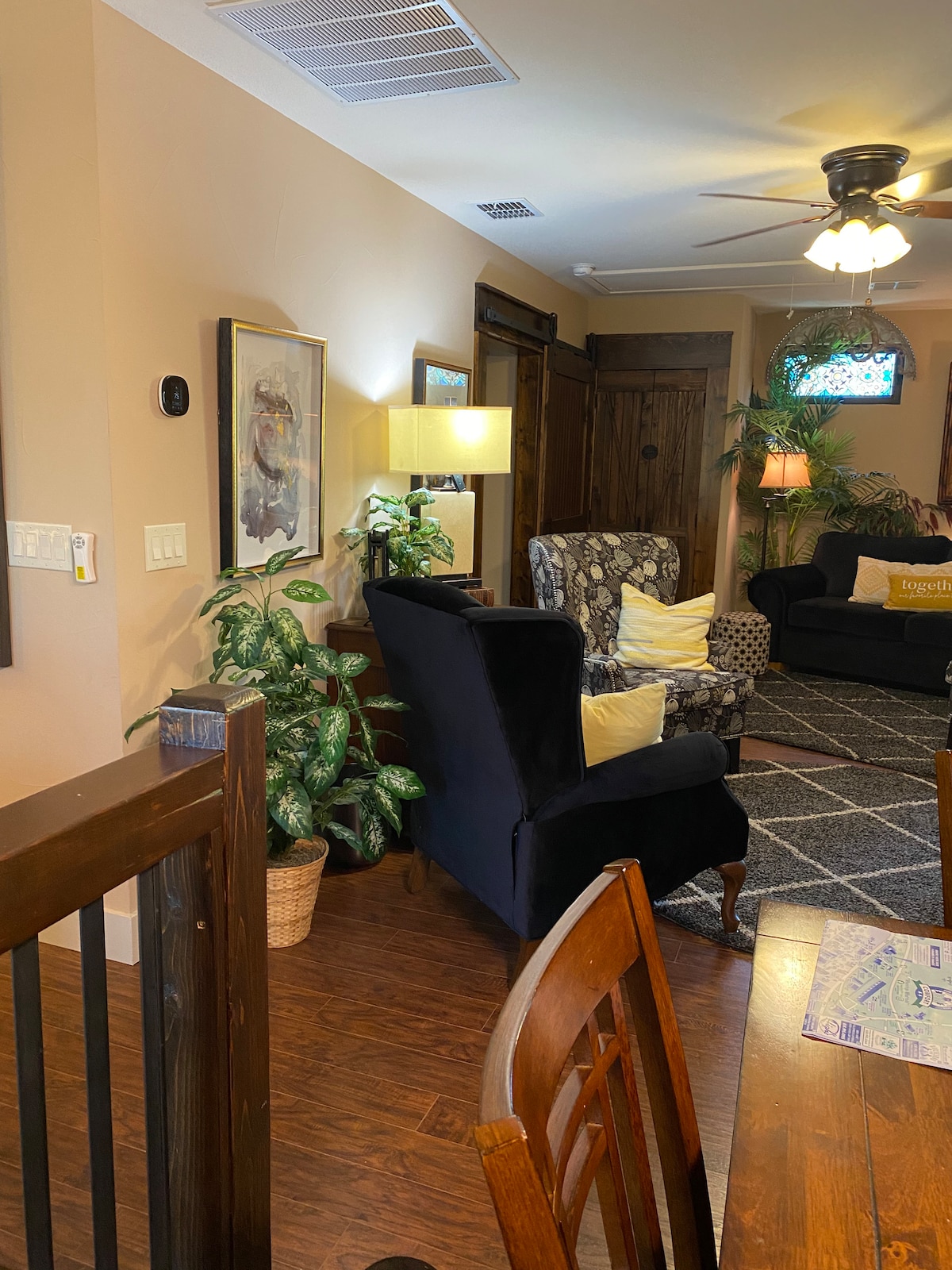 This is an upstairs fully equipped apartment that has cozy, private, romantic atmosphere. Has a covered outdoor patio, with comfy furnishings, fan, large ‘smart TV’ and gas outdoor heater. Continental breakfast goodies always included with no extra charge. Breakfast bar with ceiling fan and a view. Full kitchen w/gas stove, farmhouse sink, RO water faucet, microwave, fridge with RO ice mkr, drip & pod coffee pots, espresso maker, toaster, blender, elec mixer and griddle, slow cooker, pots/pans, dishes, silverware, etc. etc. Dining/living room with sofa, recliner, 2 occasional chairs, large ‘smart TV’, ceiling fan, electric fireplace and games. There is an enclosed area with a full sized washer/dryer for our guests convince. Large beautiful bedroom with king bed, luxury linens, ceiling fan, plus table fans on each side of bed, ‘smart TV’, makeup table with lighted magnifying mirror/fan and bench, occasional chair, dresser. Separate, tiled toilet/vanity area>marble sink vanity, large mirror and closet, plus a separate enclosed spa shower area with seat.