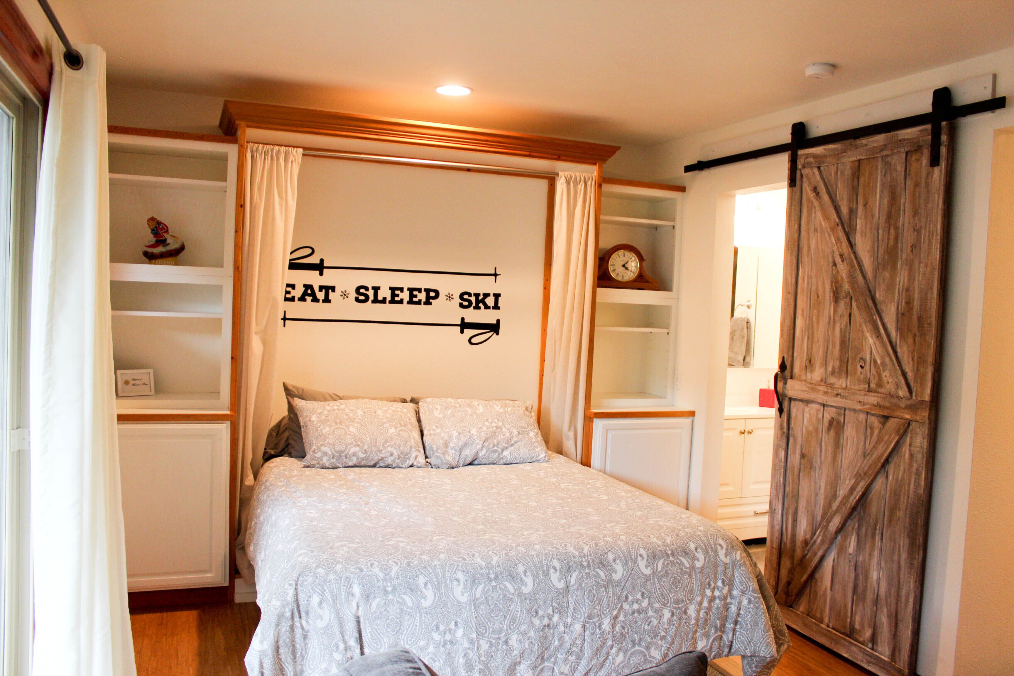 The Red Barn has a very fun and warm common space for dining, cooking and relaxing. It is well stocked with dishes, silverware and everthing needed to make a wonderful meal. The master bedroom has walk-in closet, ensuite bath and sliding door access to the back yard and ski room. The upstairs sleeping room has four twin beds and a built in couch that can be used for over flow sleeping. Kids LOVE it up their. Upstairs also has a full bath and washing facilities.
