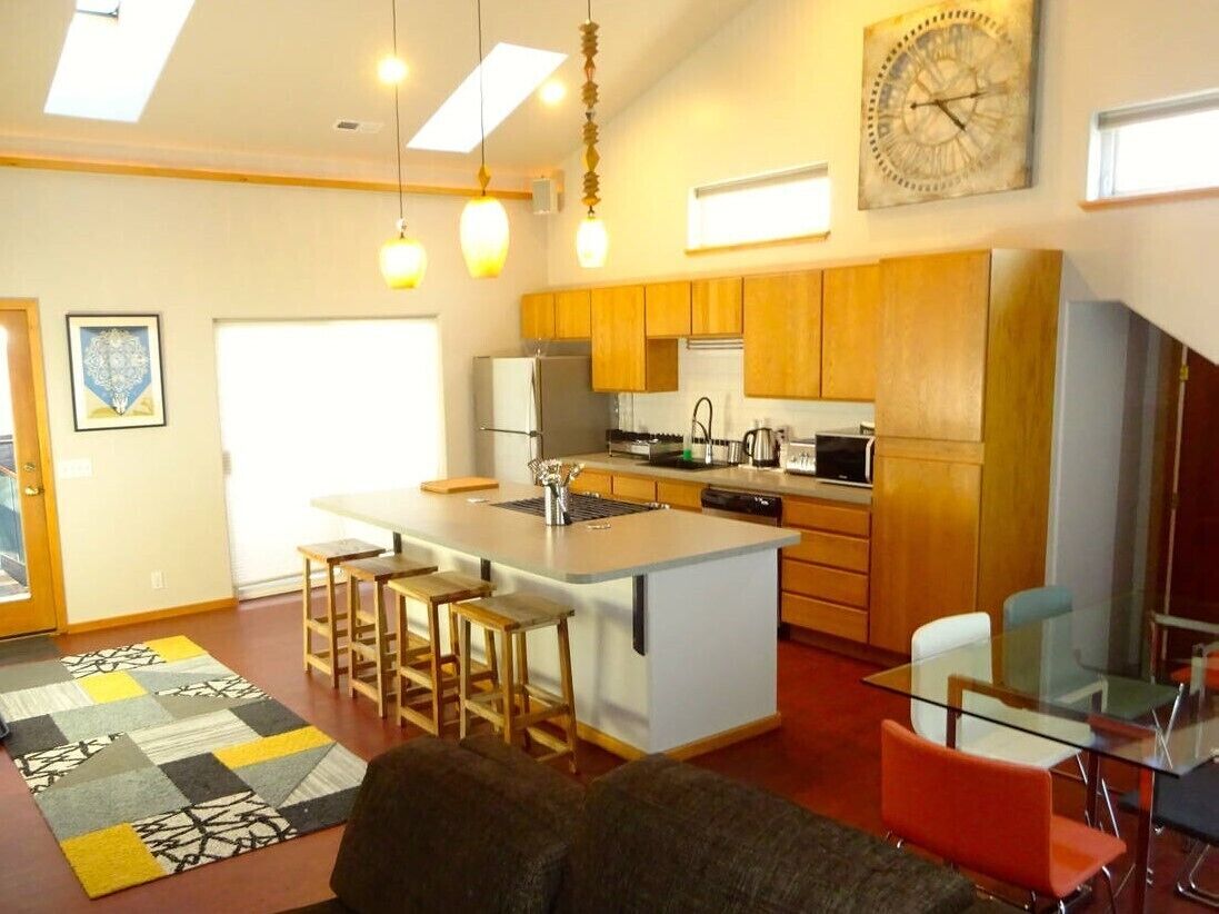 This amazing loft type apartment features two bedrooms with one bathroom. Granite counter tops accent the the gourmet kitchen. Situated close to downtown Ketchum between Warm Springs and River Run Lifts it is only a mile to world famous Sun Valley's Village and just on the north end of Ketchum in the trendy live / work environment of Northwood Way. Enjoy a 60 inch plasma TV with Direct TV movie package. Radiant heat throughout living and outdoor deck space. Fast Wi-Fi. One King Bed and one Queen Bed make for a great night's sleep. Washer and Dryer included. Microwave, Coffee Maker, Electric Tea Kettle, Oven, etc. Guest have access to everything in loft apartment area. Fine art photographs displayed throughout are available for purchase. Kirk's coffee table books on Idaho and the Snake River are also for sale. We give guest complete privacy! Our home is only 10 minutes away and we are available to answer questions or help in any way. The neighborhood is a little quirky with a mixed use of living and business activity. Our immediate neighbors are all great people with careers in design, music, art, and the trades. The new Bigwood Bread Cafe and Bakery is just around the corner to the north and it's fantastic! Daytime activity grinds to a halt around 6 pm for peaceful quiet evenings. Walking distance to 3 gyms - YMCA, Zenergy Spa, & High Altitude Fitness. Sun Valley / Ketchum features a free KART bus system with stops about 2 blocks away. The apartment is located on top of a working photographic warehouse and is accessed by 26 steps. Sing the alphabet song as you ascend to the serenity of the Gallery Apartment above.