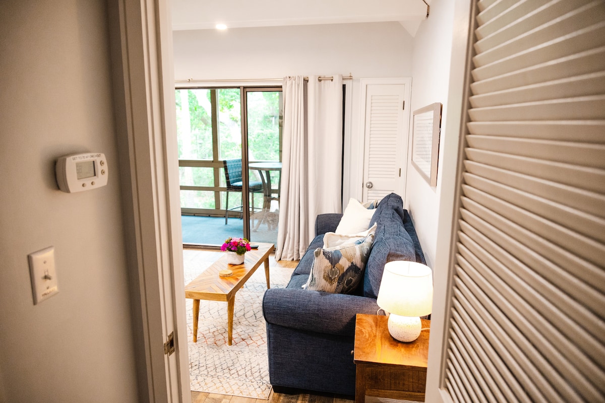 This woodland villa comfortably accommodates up to 4 guests wiith 1 spacious bedroom and a sofa sleeper in the living area for an additional 2 guests. The master bedroom offers a queen size bed, TV, and access to the sundeck. The private full bathroom features a tub/shower combo and is accessed from the guest suite as well as through the hallway for additional guests.
