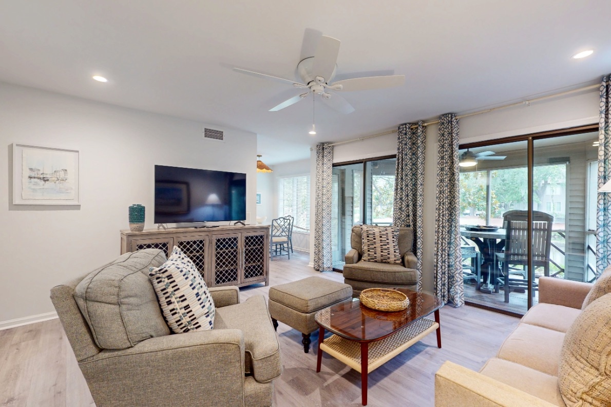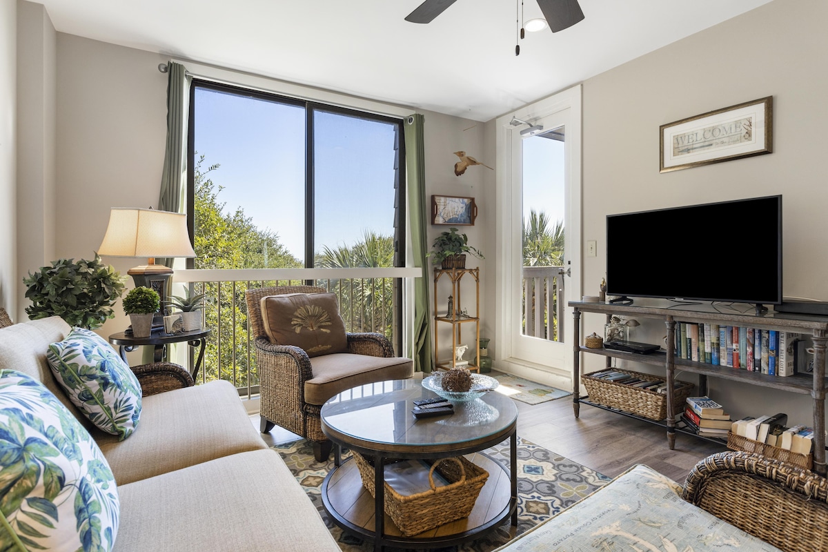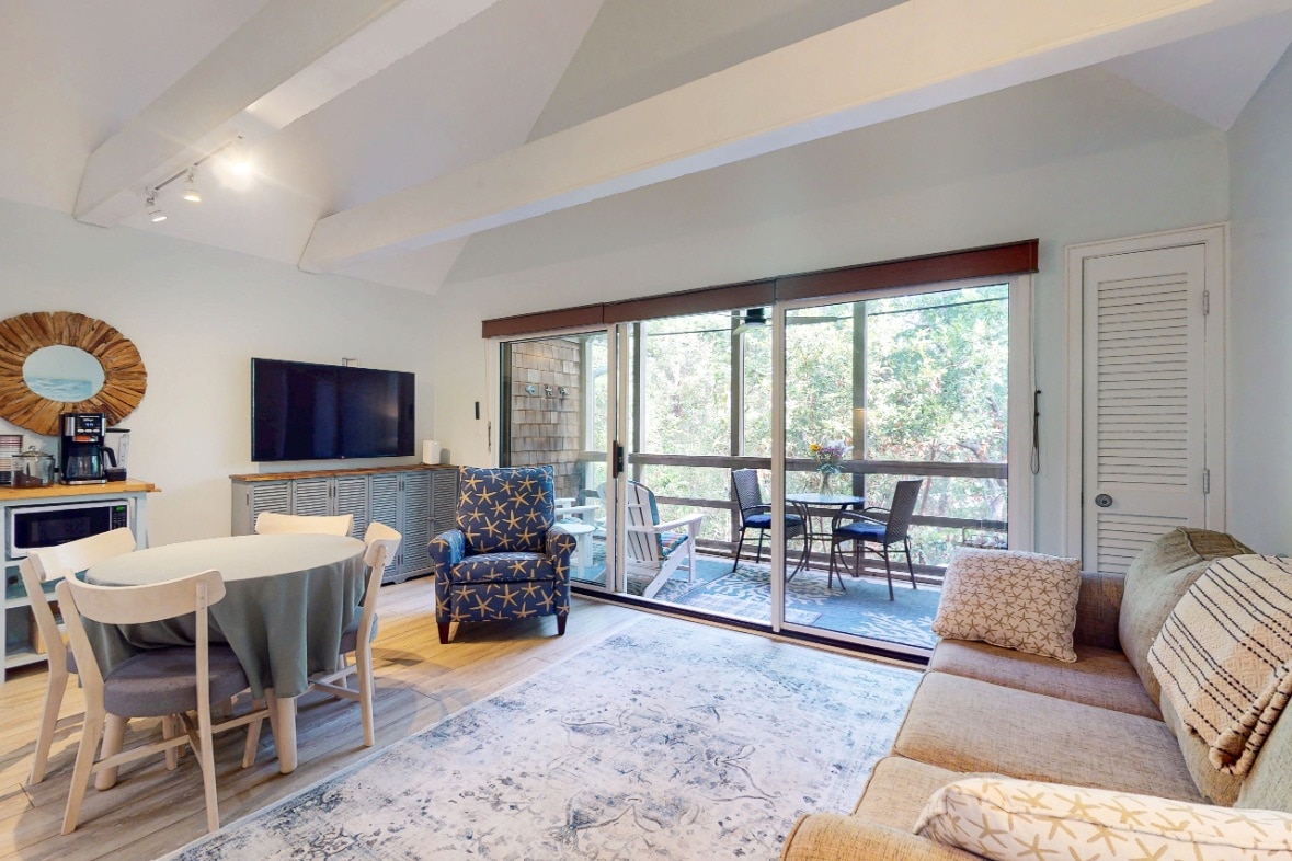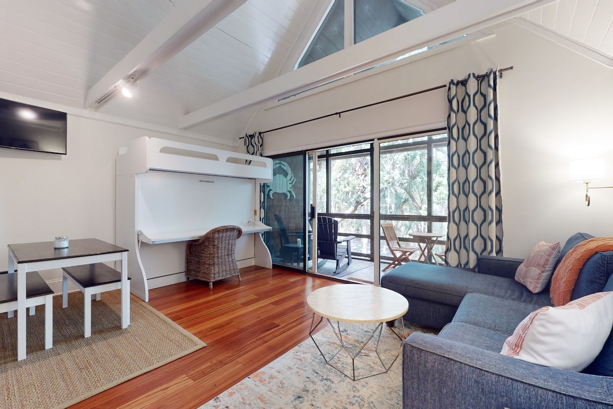 This second-floor villa offers serene wooded Island views from inside and out. The open plan living area features a sofa sleeper, comfortable seating area, TV, and access to the private outdoor sundeck through sliding glass doors. Just off the living area is the designated dining nook with seating for four. The kitchen is well-equipped with all you need for home cooked meals and high-end appliances.