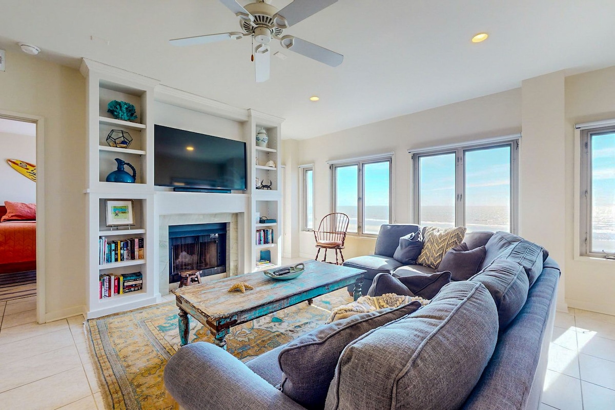 This spacious Windswept villa offers a very open layout with plenty of natural light via floor to ceiling windows boasting gorgeous ocean views. The kitchen is well appointed with granite countertops, choice appliances and a wet bar and opens to the dining and living areas with comfortable seating to accommodate 8. The living area includes a fireplace and mounted flat screen TV. An oceanfront balcony expands the width of the entire villa offering sweeping views and plenty of space to enjoy ocean breezes, cocktails or a great beach read.