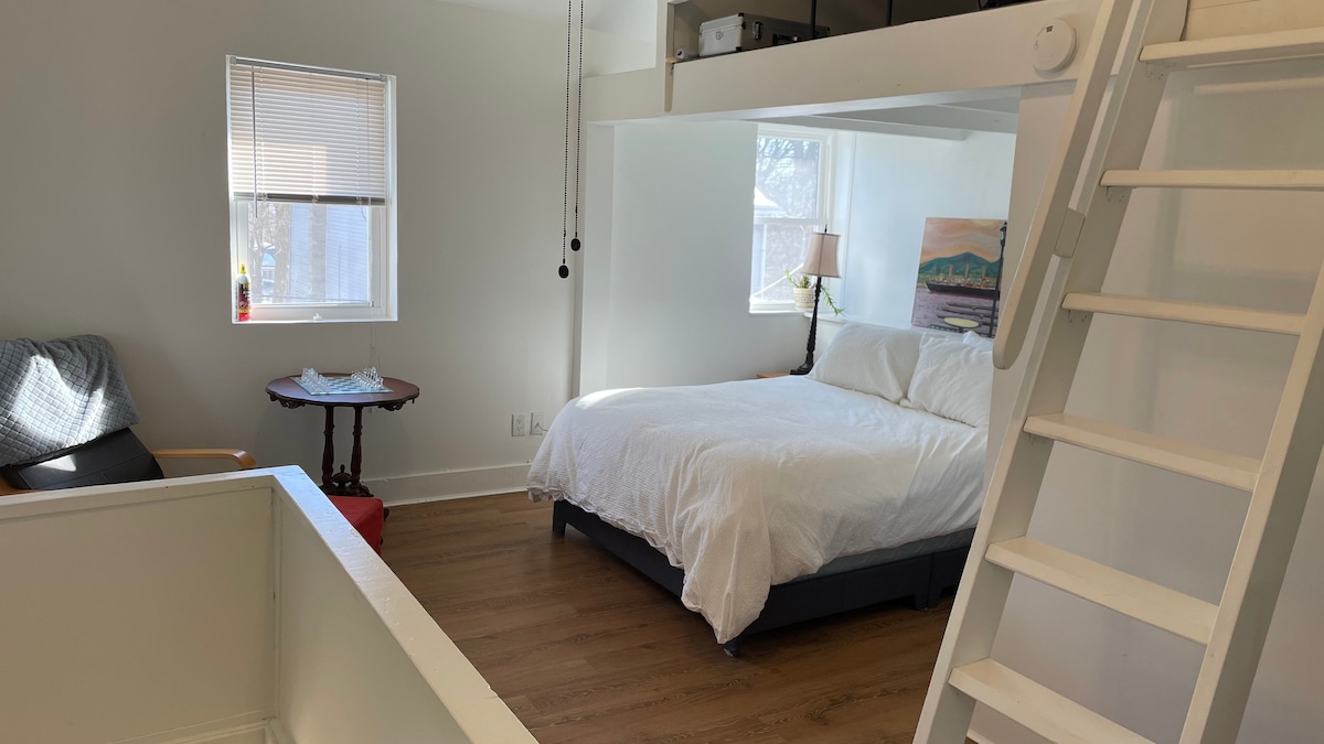 Located in historic Uptown Kingston, this space is conveniently located and exceptionally spacious. This two floor loft space is spread across 1600 square feet with rustic hardwood floors, two queen beds on separate floors, a full bath, kitchen, dining table and living spaces on each floor. Walkable to grocery, coffee, take out, park, bicycle rental, liquor store, all the essentials!
