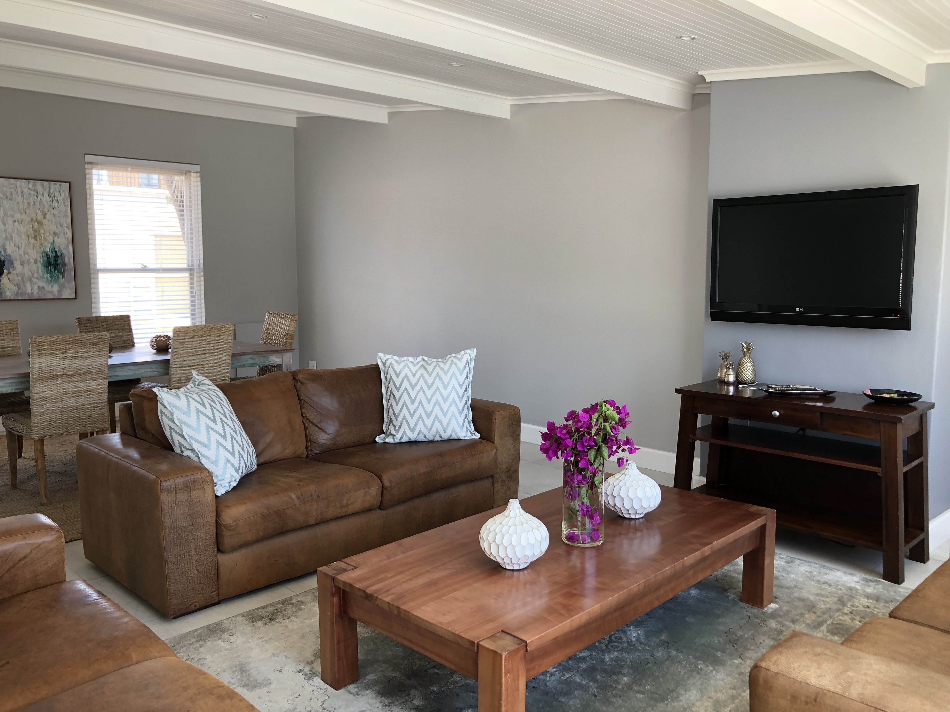 The kitchen is well-equipped and features a stove, oven, induction plate, fridge/freezer, kettle, Espresto coffee machine, toaster and microwave and an automatic washing machine. The dining area has seating for 6 people, while the lounge/dining room has a comfy couch and 2 sleeper couches, a flatscreen Tv with full premium package Dstv channels and a Dvd player. Free Wi-fi is also available.