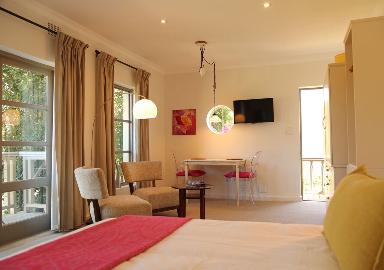 The lounge and kitchenette are open-plan with a dining area for two. The kitchenette has a double plate electric hob, fridge/freezer, microwave and Nespresso Machine. The TV is linked to DSTV sport channels and a ceiling fan is also found in the lounge for warmer days.