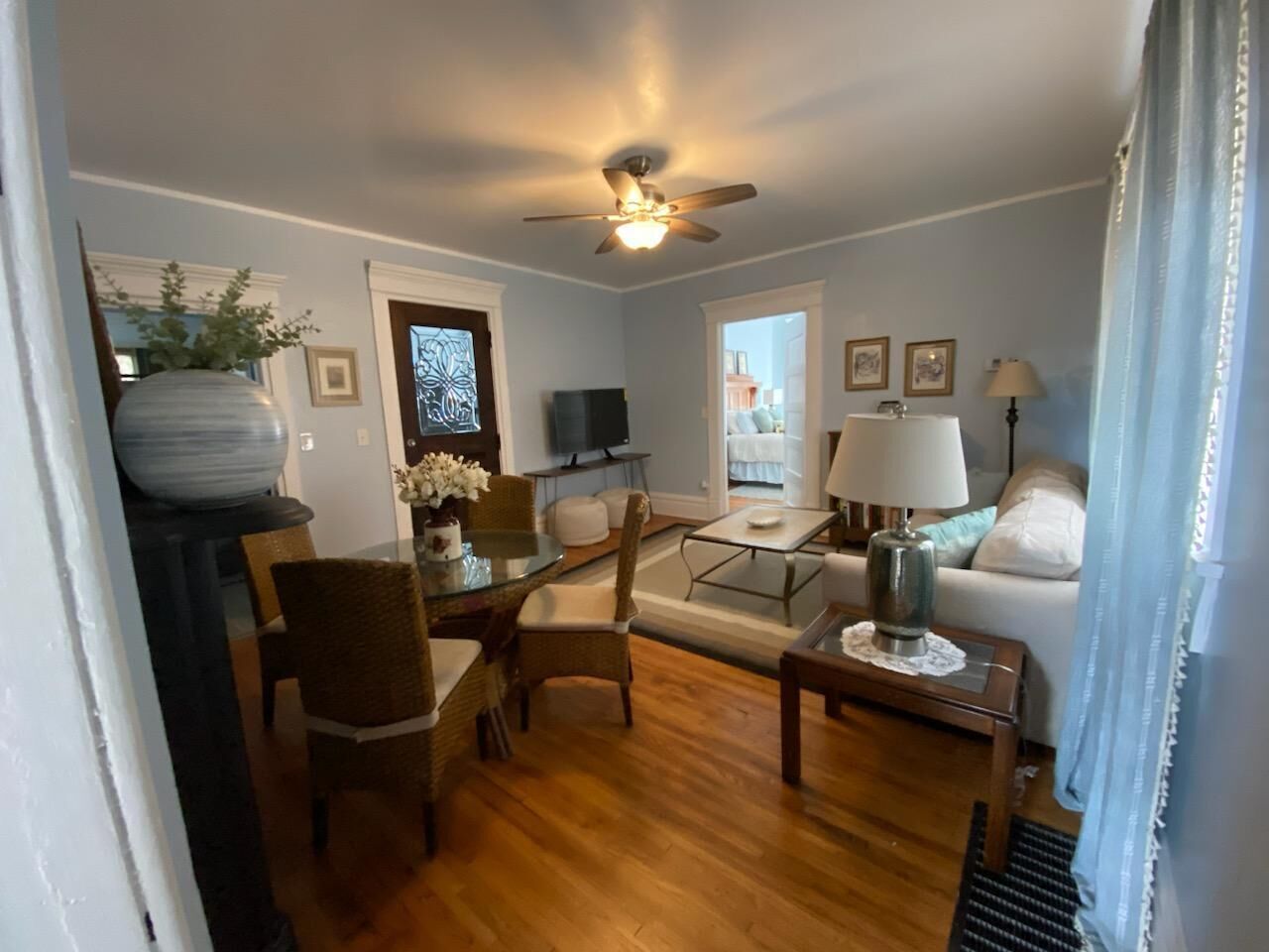 Cozy three room studio just one block from the center of town. Within walking distance to the library, courthouse, museum, and several good restaurants and antique shops. Off the street parking right outside your door. Kitchen contains toaster, coffee maker, microwave and a small fridge containing bottled water.