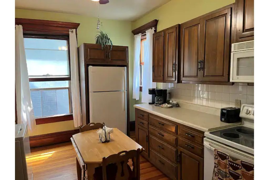 Enjoy your stay in the old servant’s quarters of the manor built by circus owner Jeremiah Mugivan. This completely remodeled upstairs apartment with kitchenette is located in the carriage house. This Studio apartment has a sitting chair and small dining table with 2 chairs. Kitchenette features microwave, K. Cup coffee maker, toaster, refrigerator, plates and silverware. This apartment has a queen bed with full walk in closet. Towels and linens are provided. One block from downtown- walking distance to several restaurants, boutique shopping and coffee shops. The local museum is within walking distance and the circus museum is only a few miles outside of town.