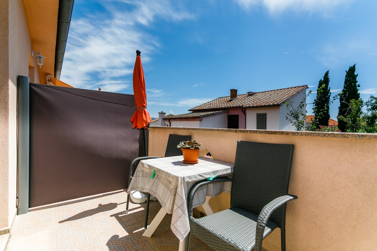 - "The apartment is conveniently situated between city and beach, very clean and modern and offers anything you need for relaxing holidays (even fly screens at the windows) What we especially appreciated were the useful tips of the extremely friendly landlord." - "A very nice, well maintained and perfectly situated apartment 5 min walk from both the town and beaches with almost all the facilities needed. With addition of a small oven the kitchen would be perfect. The house contains more apartments and in the one we had you have to pass through one of the bedrooms to reach the other making the apartment fine for a family but perhaps less suitable for two couples. Though it was not an issue for us one should also know that the terrace of this particular apartment is a pass-through terrace for other guests of the house too. Tiho, the host, is extremely helpful and informative about the good sights and beaches around Krk and goes far to fulfil your needs including lends out his bikes if you want to explore the city and surroundings. All in all we can highly recommend this apartment."