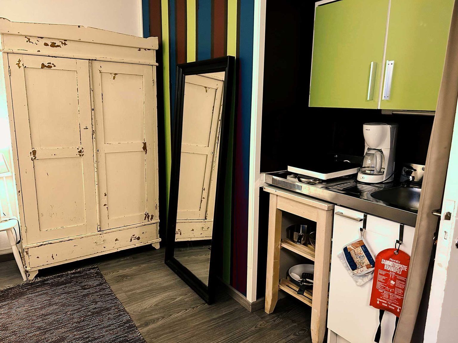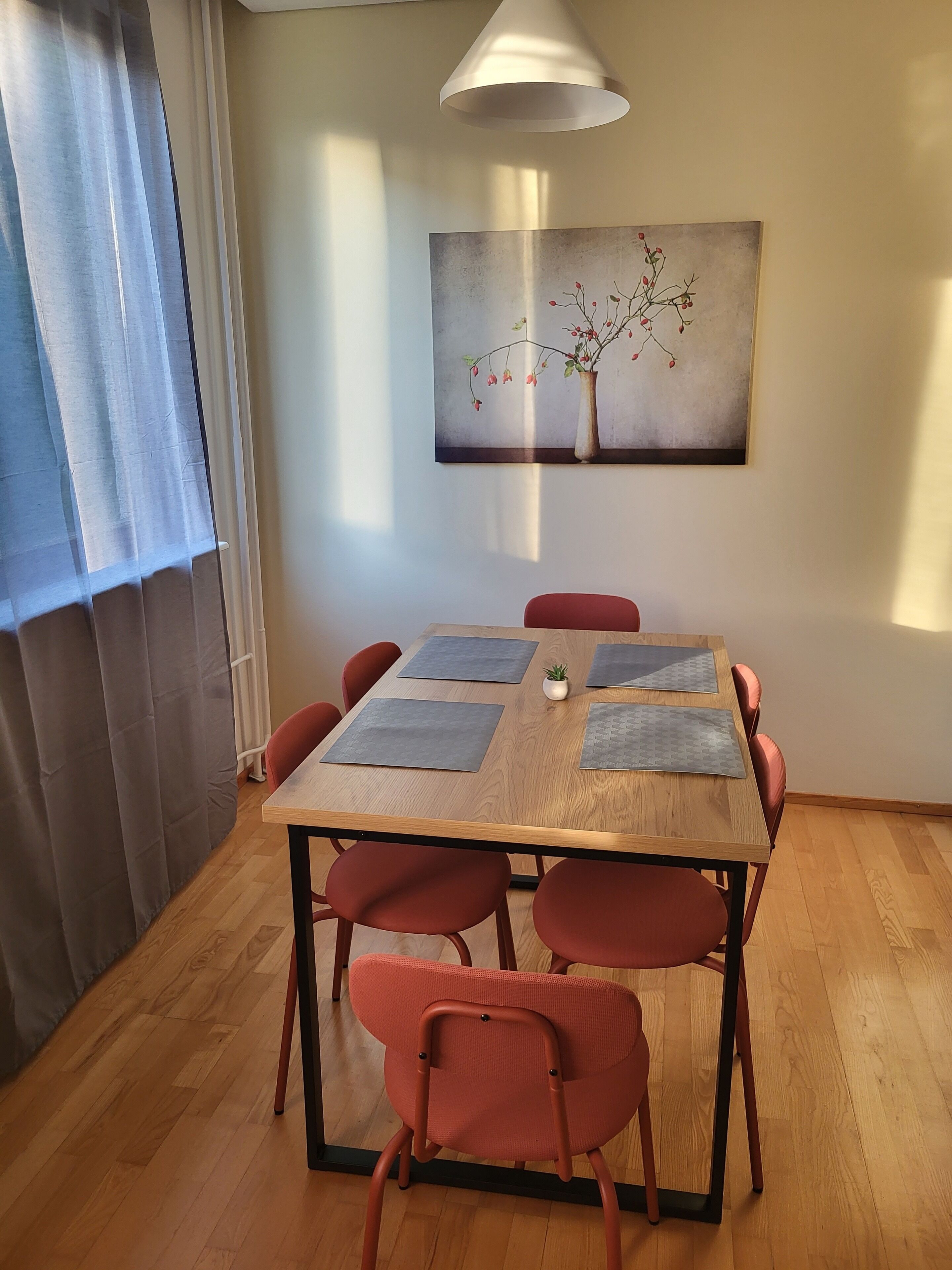 The apartment is in an old terraced house and has its own windows. For example, there is a missing floorboard somewhere, the bathroom cannot be locked. There are few sockets, extension cords in front of it. The apartment has an open staircase, no security gate. The soul of the home is greater than the shortcomings! This is, above all, a Home. I live here with children who live in shifts for weeks. I only host when my children are not here. My home is 2 km from the city center, 2.5 km from Kys and 2.5 km from Puijo. Buses pass by the backyard. Within a radius of one kilometer, there is a Lidl and a K-market, and Irene Partanen's bakery is next door. Less than 0.5 km away is a playground and a small outdoor fitness area.