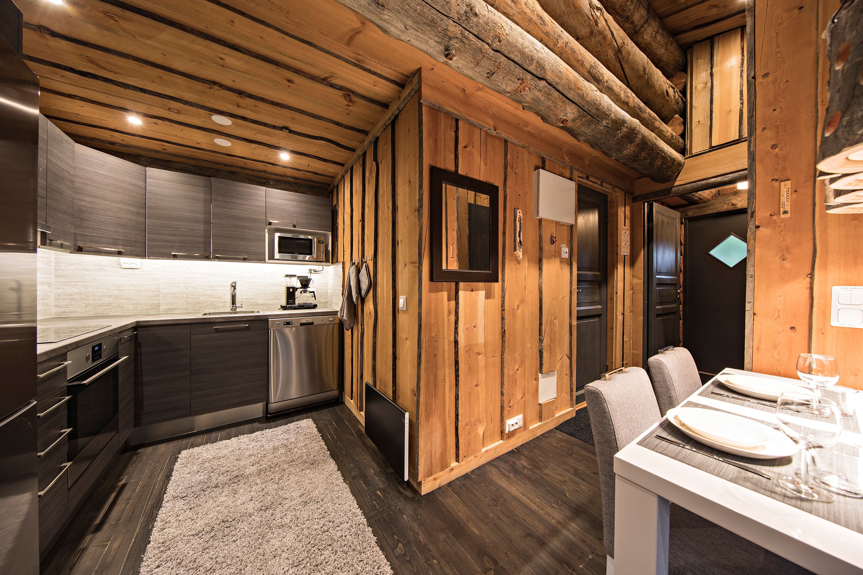 The compact kitchen is well-equipped with appliances, cookware, and dinnerware to prepare delicious meals. After a day on the slopes, use the drying cabinet to ensure your gear is ready for the next adventure.