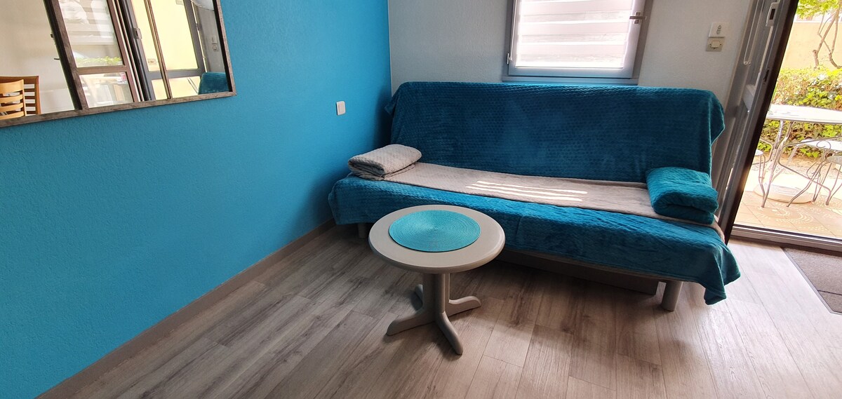 Studio cabin on the ground floor with terrace and private garden, close to the beach (200 meters). Small convenience store and pharmacy nearby (50 meters). Private parking. Living room with a closet bed for 2 and 2 bunk beds in the entrance. Bathroom and separate toilet. Kitchenette. Two adult bicycles available .