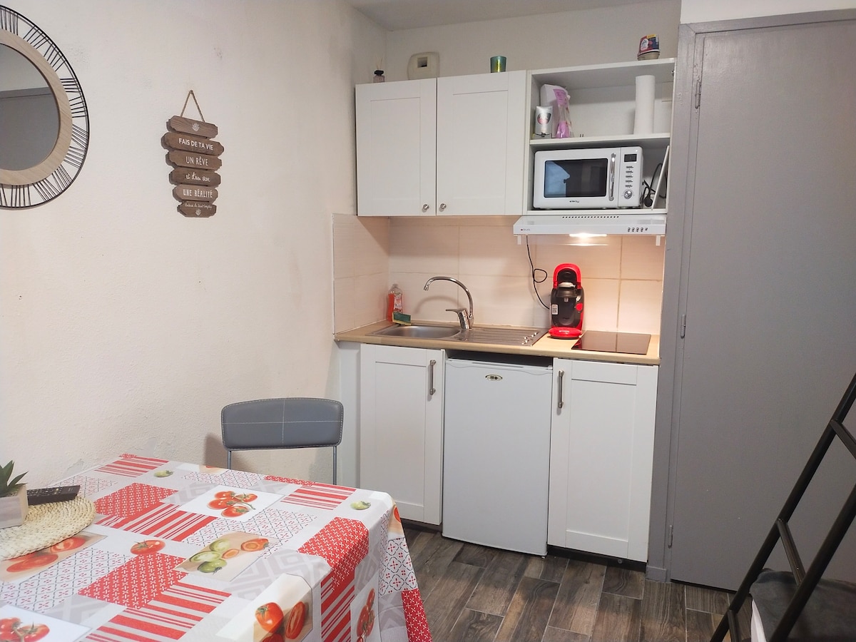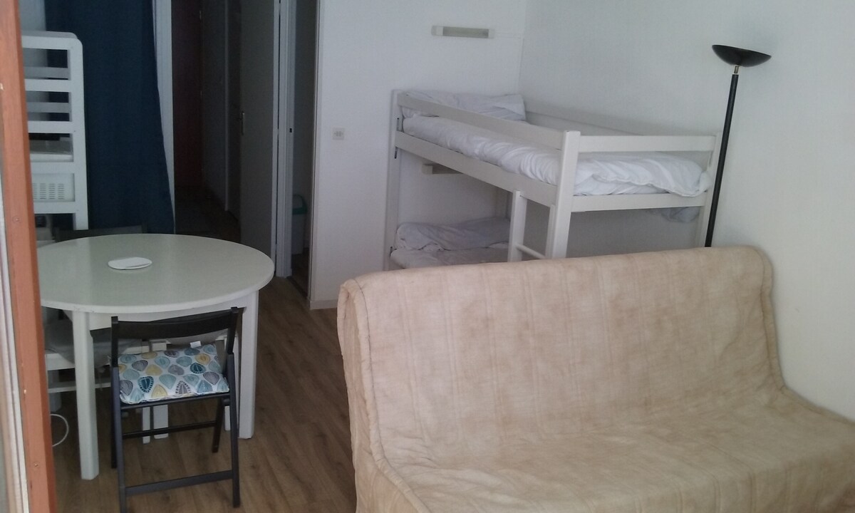 studio with balcony perfect condition and well equipped, 4 people 23 m2, all comfort, entrance 2 bunk beds, bathroom with sink, bathtub and toilet, kitchenette 2 electric plates, living room refrigerator including storage closet, 1 sofa-click, 1 table and 4 chairs , dresser , sideboard and shelf cabinet, bedside , TV, microwave electric coffee maker, toaster ,kettle....