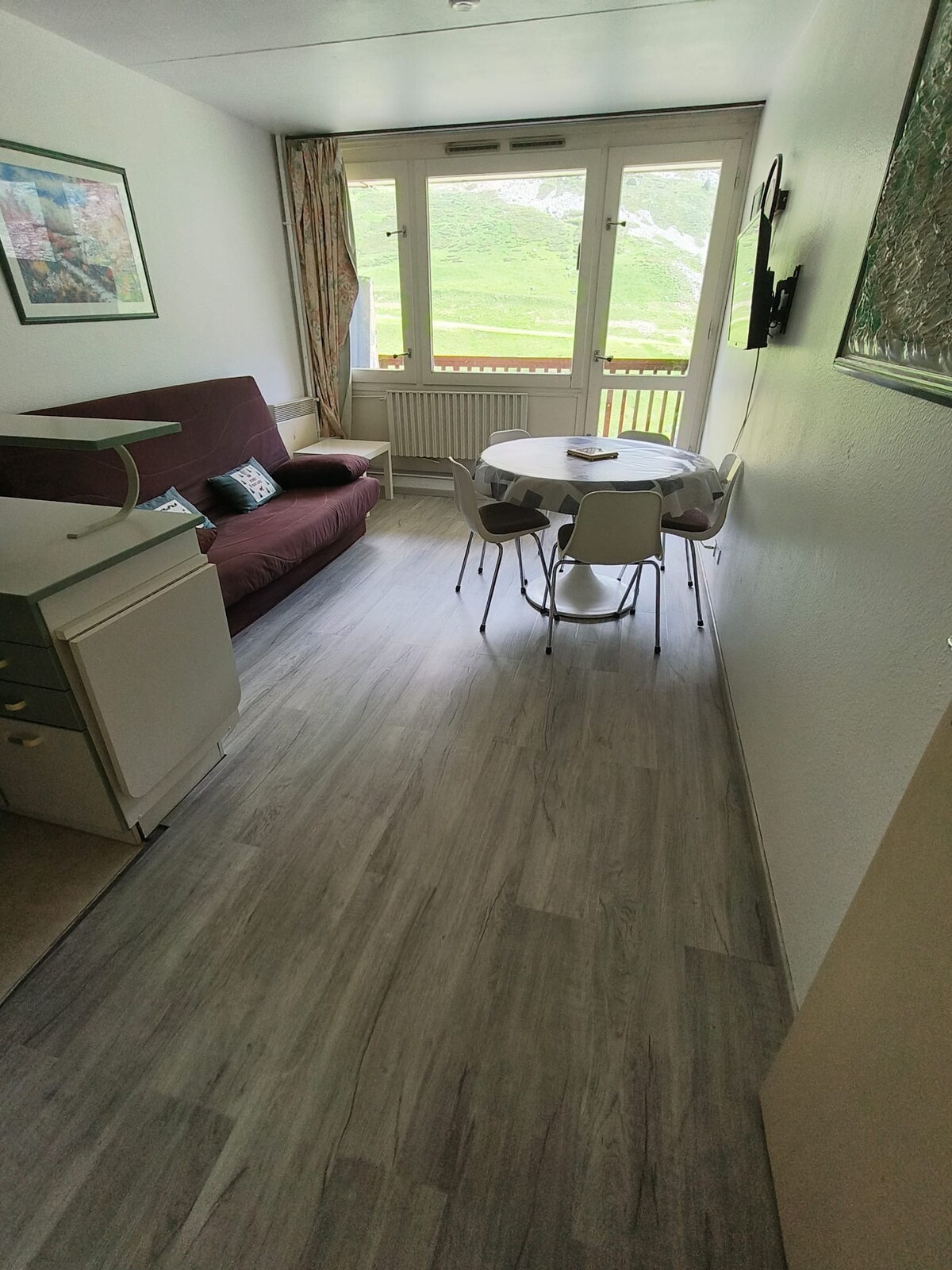 Charming studio sleeping 6 located on the 4th floor with elevator, loggia (closed) facing south, view of the mountains and the resort. Living room equipped with a television, a sofa bed (good comfort), in the entrance corridor bunk beds (2x90), at the entrance a 140 bed. Kitchen area with induction hob, oven, senséo coffee maker, appliance raclette, dishwasher. Separate bathroom and toilet. South-facing balcony offering a magnificent panorama of the resort and the domain. Parquet floor. Non-smoking studio. Ski locker in the DRC.