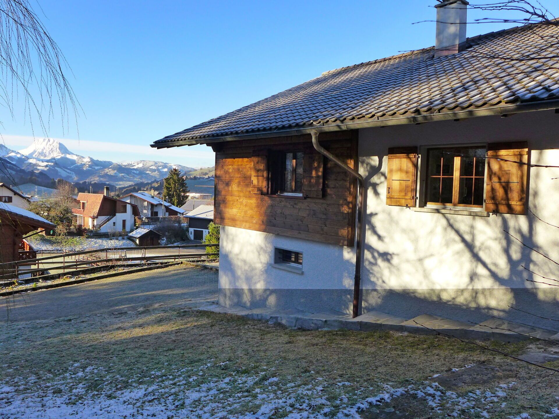 Charmey: Beautiful, rustic chalet "Clairval", 887 m a.s.l 3 storeys, surrounded by trees and meadows. In the resort. Private: large garden (fenced). In the house: storage room for bicycles, storage room for skis. Parking (for 5 cars), single garage. Parking space or garage only for small to medium-sized cars. Supermarket 700 m, restaurant 500 m, bus stop "Corbettaz" 700 m, outdoor swimming pool, indoor swimming pool 650 m, thermal baths "Les Bains de la Gruyère" 350 m. Tennis, minigolf 600 m, sports centre 650 m, walking paths from the house 1 m, cable car 1 km, ski rental 900 m, cross country ski track 1.5 km, ice rink 1.5 km. Nearby attractions: Château de Gruyère 12 km, Maison Cailler 6.6 km, Bulle 11 km, Les Gorges de la Jogne, Gstaad 48 km, Montreux 48 km. Well-known ski regions can easily be reached: Charmey 1 km, Moléson 16 km. Well-known lakes can easily be reached: Lac de Gruyère. Hiking paths: Charmey 1 km, Moleson 16 km. Please note: car recommended.