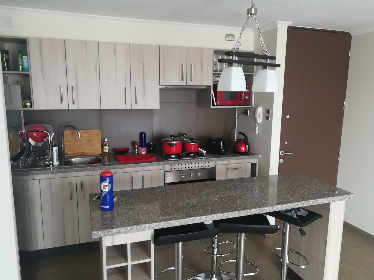 coquimbo apartment, ideal for two people, has a double bed, cover (you must bring your sheets and covers), in addition it has a hairdryer, pots, plates, cups, amenities and minibar, equipped kitchen, comfortable closet and private bathroom. The building has a common area with a 360° terrace, swimming pool, event room and quincho, steps from downtown and coquimbos gastronomic area, near the mosque.