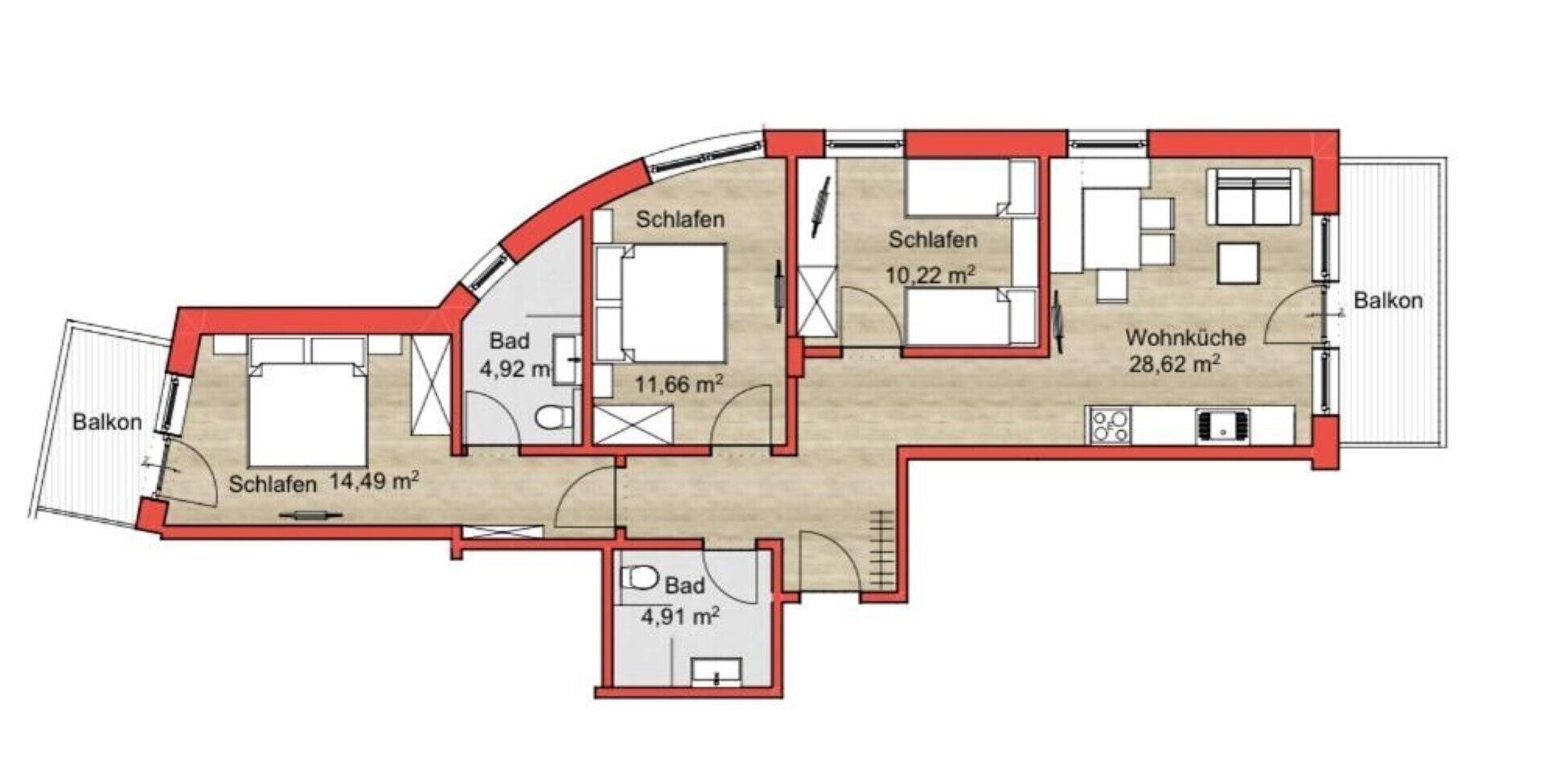 4-room apartment 85 m2, on the lower ground floor. Comfortable and tasteful furnishings: entrance hall. 3 double bedrooms. Living/dining room with 1 double sofabed, cable TV and tiled stove. Exit to the terrace. Open kitchen (dishwasher, 4 ceramic glass hob hotplates, microwave) with dining nook. 2 showers/WC, sep. WC. Terrace. Terrace furniture. Facilities: safe, hair dryer. Internet (WiFi, free). Please note: smoke alarm.