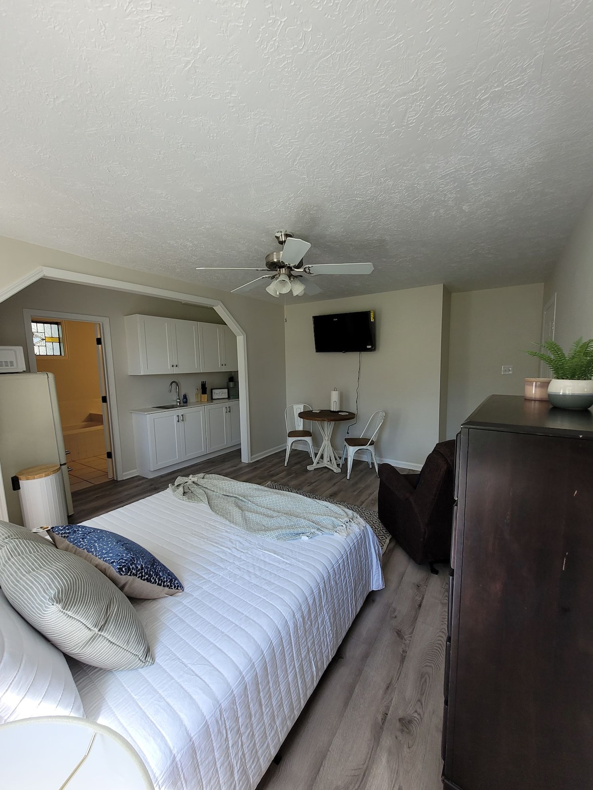 Inquire for Short & Long Term Stay & additional guests. This Spacious Unit offers 1-2 bedroom apartment offers a kitchen complete with a full size refrigerator, microwave, Keurig and fully furnished. Huge living space with sleeper sofa, side chairs/stools, desk and television. A great space to rest and entertain in. Sizable Master Bedroom is furnished with California King Bed, all luxury end bedding, and Television. Streaming Devices include FireStick for each Living Room and Master Bedroom.