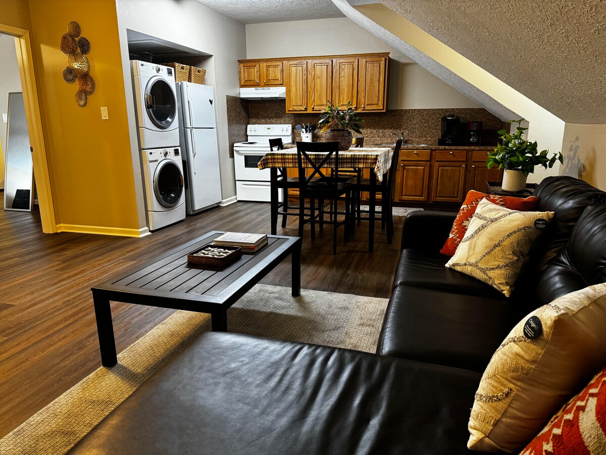 This is a modern hotel style studio with private bathroom. The bathroom has a shower no bath tub. Washer and dryer is located in a closet in the bathroom. Comfortable open floor plan. The living area, kitchen area and bedroom open into the room. Living areas is furnished with a desk for workspace, sofa, and chair. Flat screen TV, cable and wifi included. The kitchen is fully equipped with common appliances, dishes and utensils. Also supplied in the room is a Keurig coffee maker with coffee, sugar and cream.