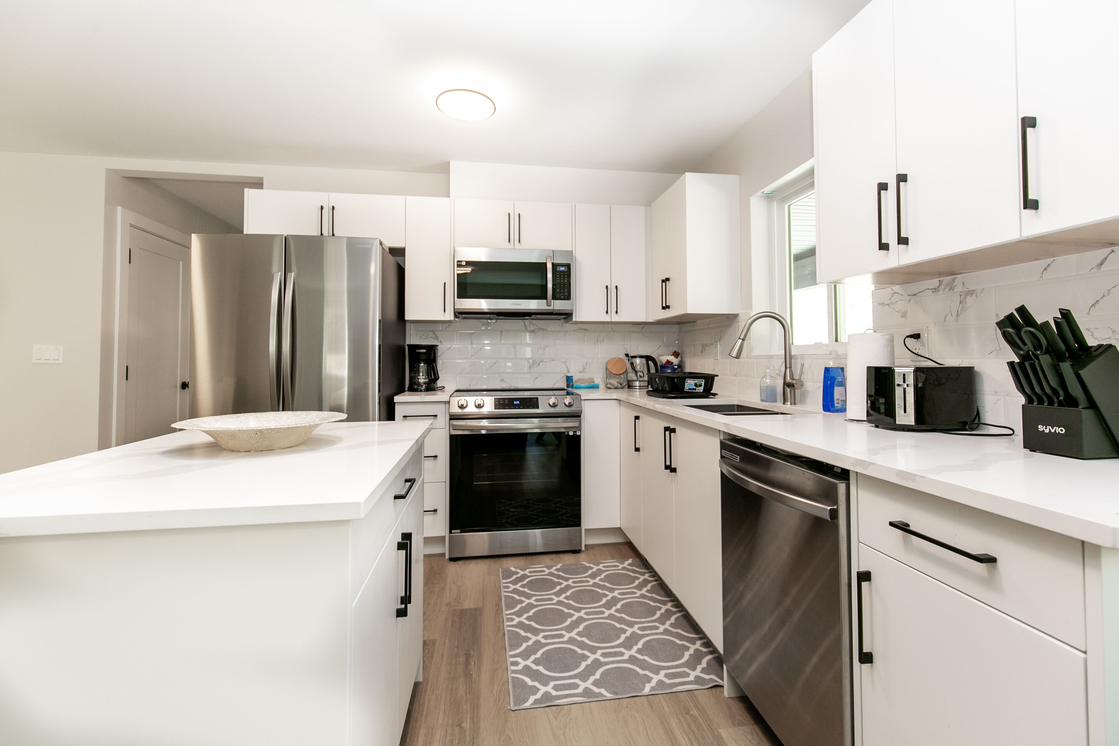 The kitchen boasts granite countertops, refrigerator, stove, microwave, dishwasher, as well as small appliances (blender, toaster, coffee maker), dishes & cutlery. Other amenities in this suite include an electric fireplace, washer & dryer, Hi Def TV w/PVR and Netflix. Both indoor and outdoor dining tables seat 4 ppl. There is a propane BBQ with utensils for the outdoor chef.