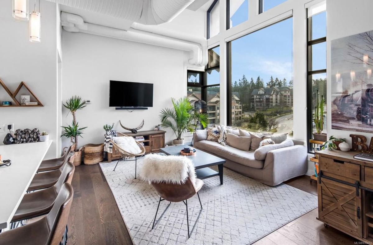 Spacious Living Area: The open-concept living space is designed with modern aesthetics, featuring high ceilings and expansive windows that flood the area with natural light. Enjoy panoramic views of the lush Bear Mountain golf course and the majestic Vancouver Island landscape.