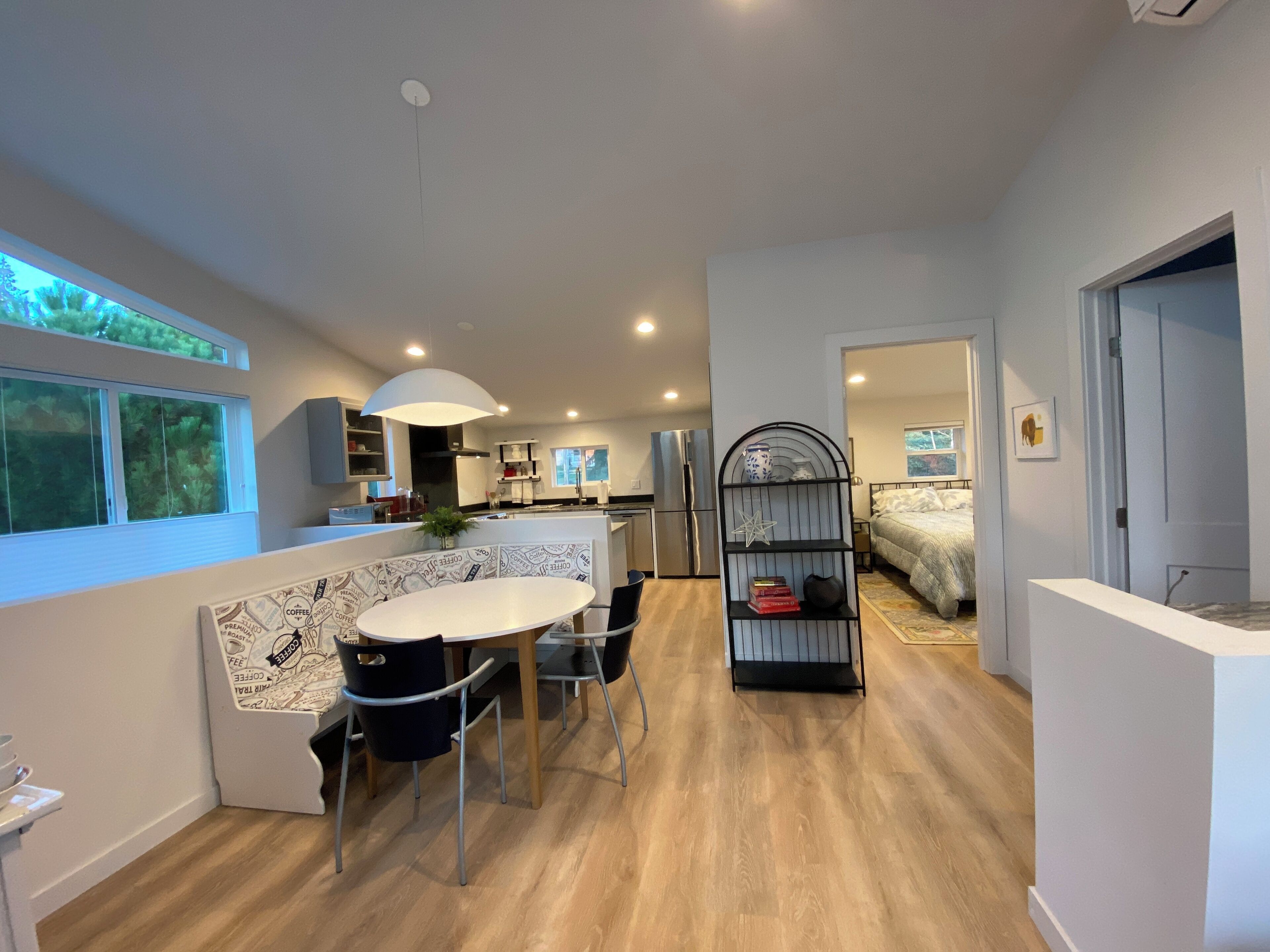 Unwind in this serene guest suite, perfect for the solo traveler seeking peace and tranquility. This downstairs studio offers a stylish and cozy retreat. Trundle bed serves as both a couch and, when expanded, a comfortable king bed.