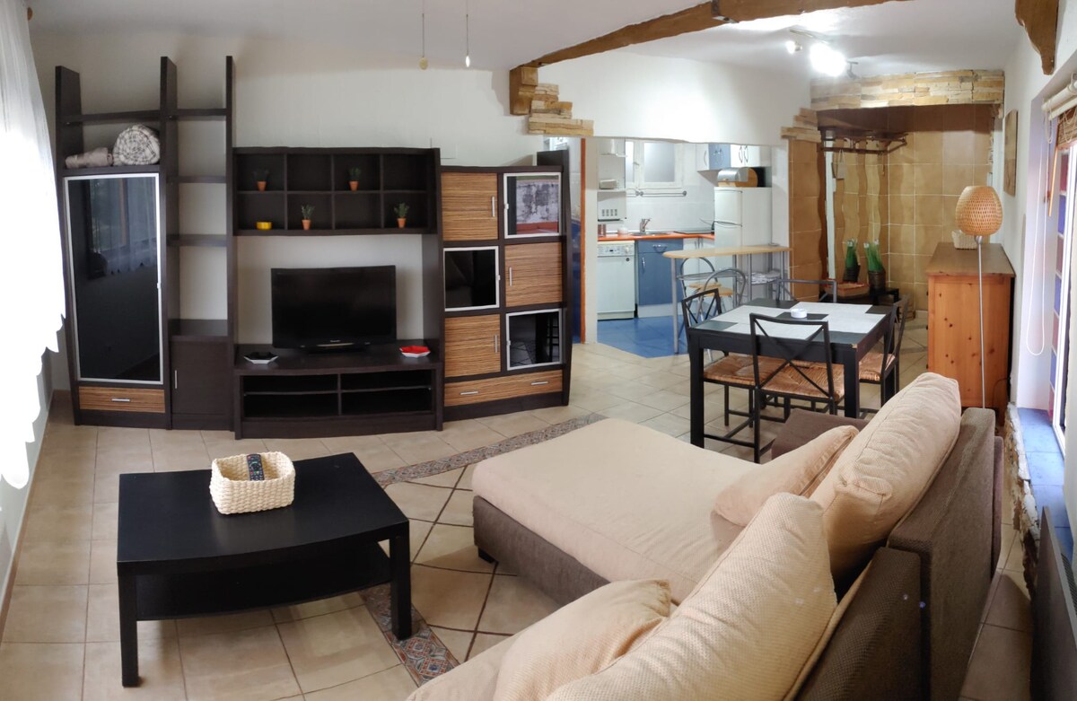 - offers a dining room with dining table or work, a sofa for 3 and chairlonge, on which is the bed one of 1.35. furniture with TV and super spacious closet with crockery and glasses, and linens.