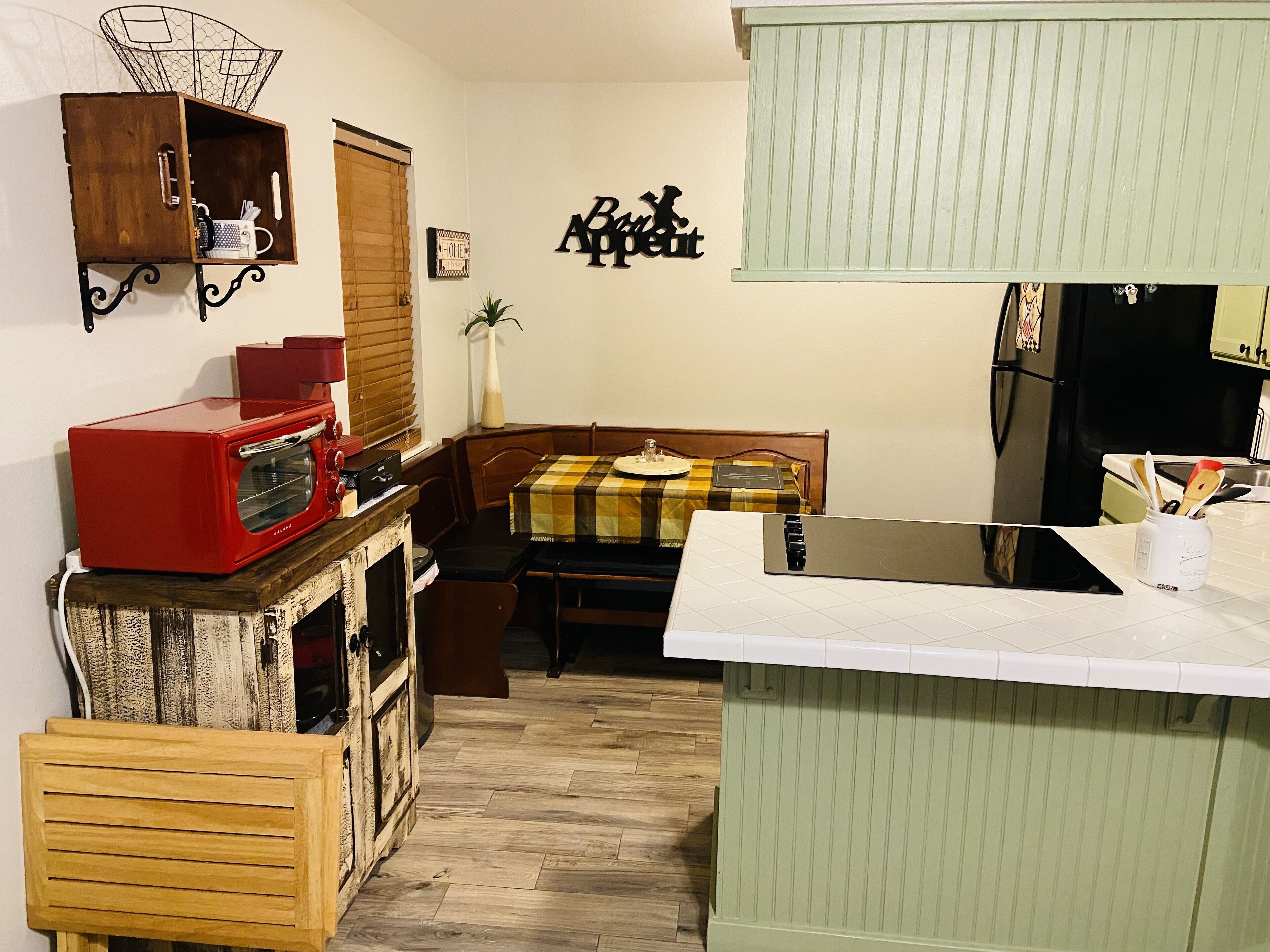 KITCHENETTE: Mini fridge, microwave w/ air fryer, Keurig coffee maker w/ Italian coffee, wine glasses, dishware