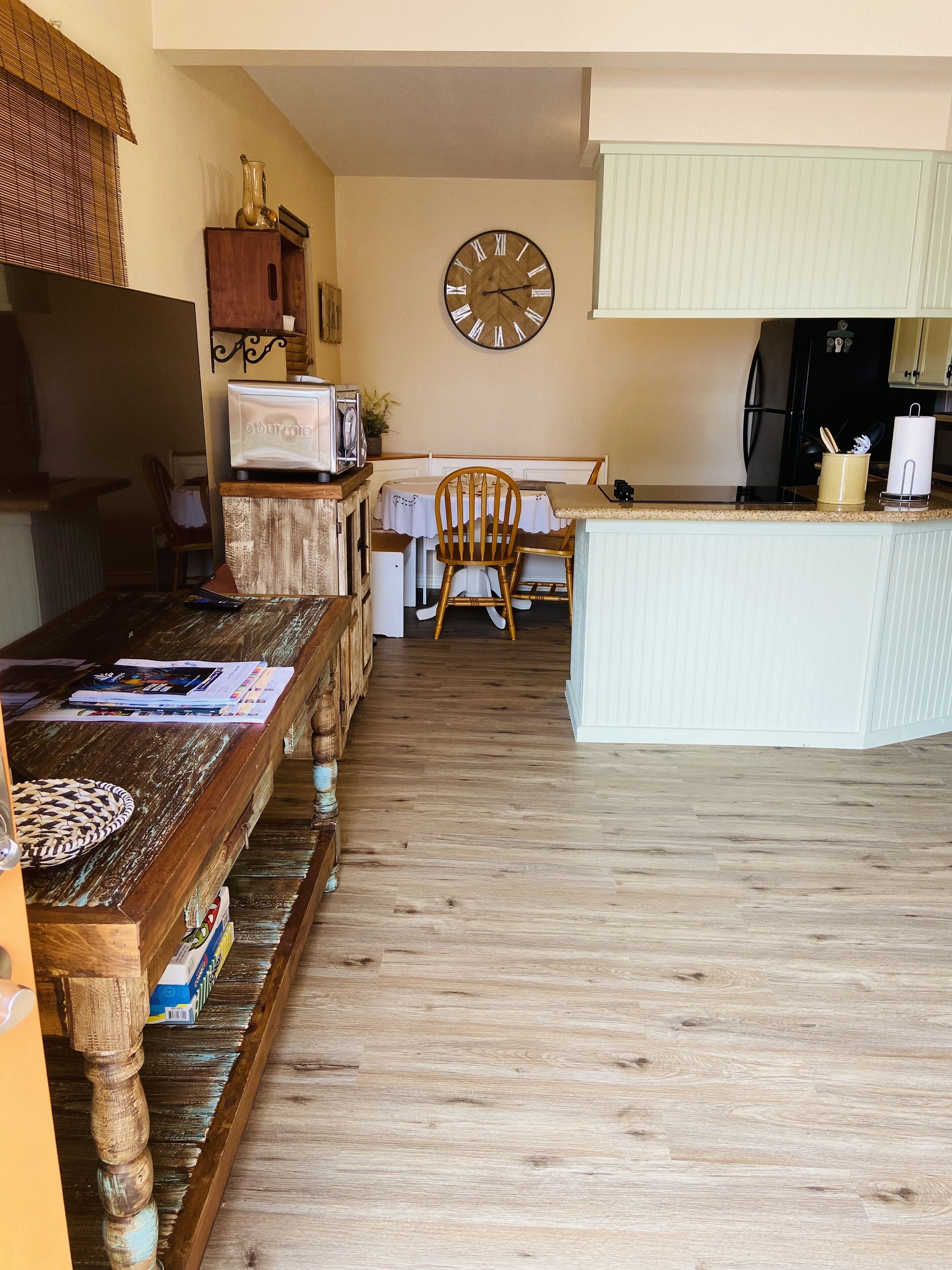 Experience our Western style home instead of a limited hotel room. This property features a full kitchen, dining area, and cozy couch.