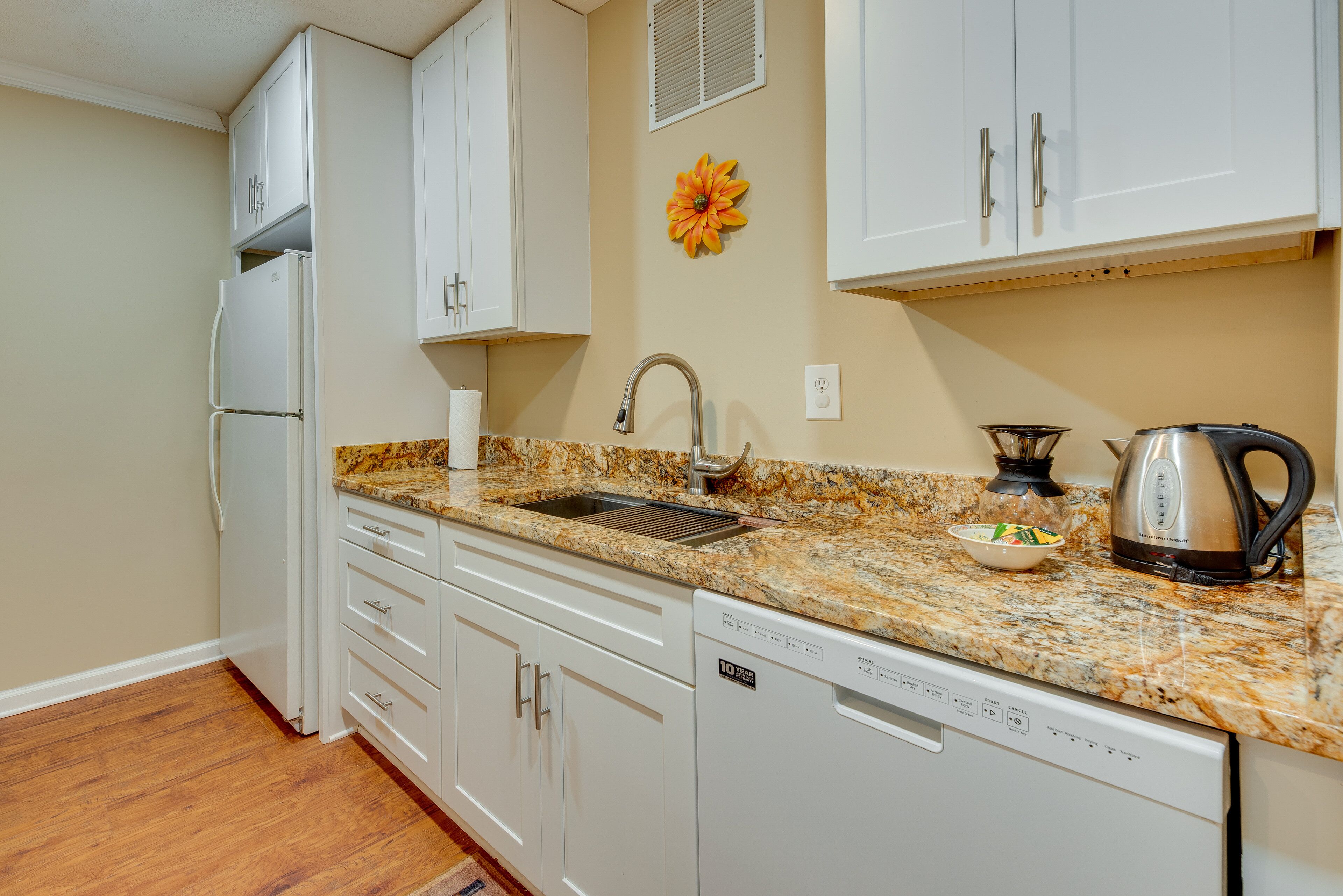 The well equipped kitchen has a stove/oven, large fridge freezer and a hot beverage station, with endless flavors of coffee and teas! The appliance station will give you more options for cooking and holds an air fryer, crock pot and small grill/toaster.