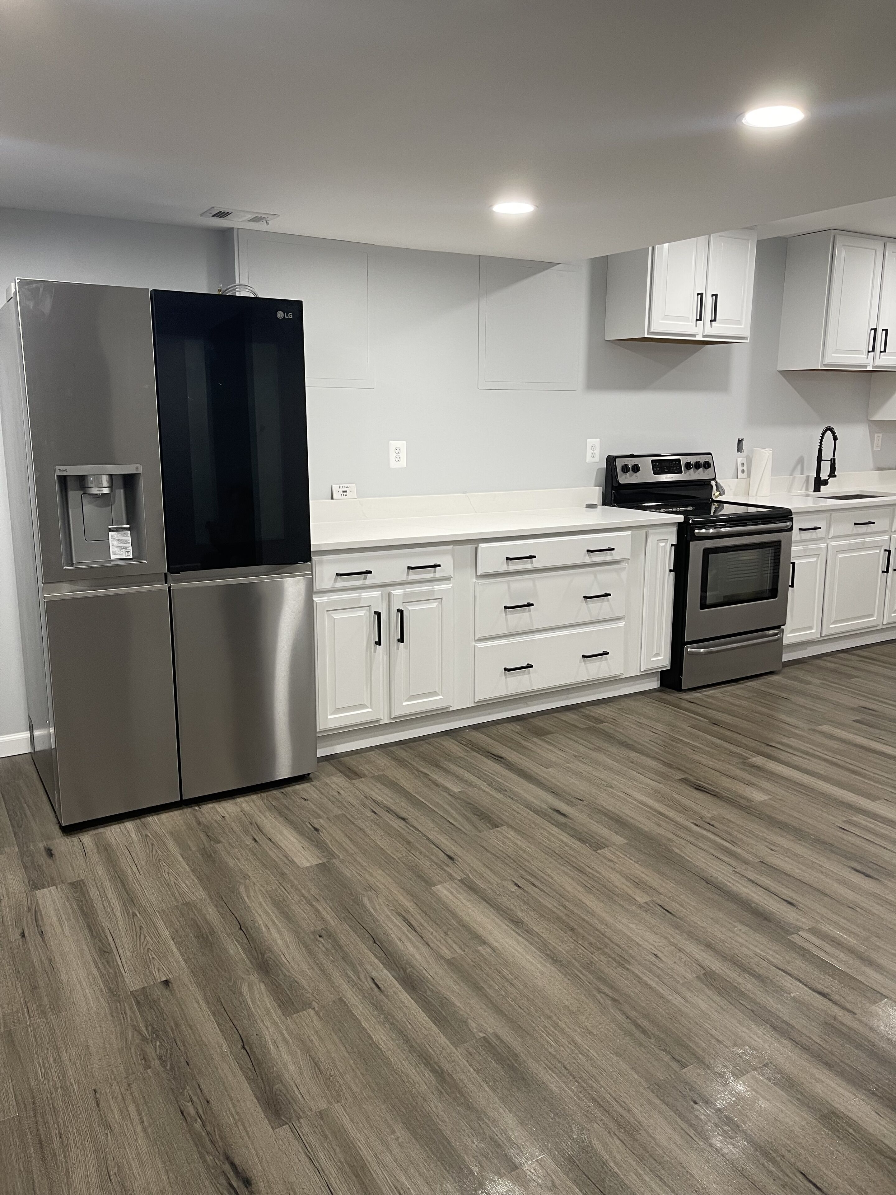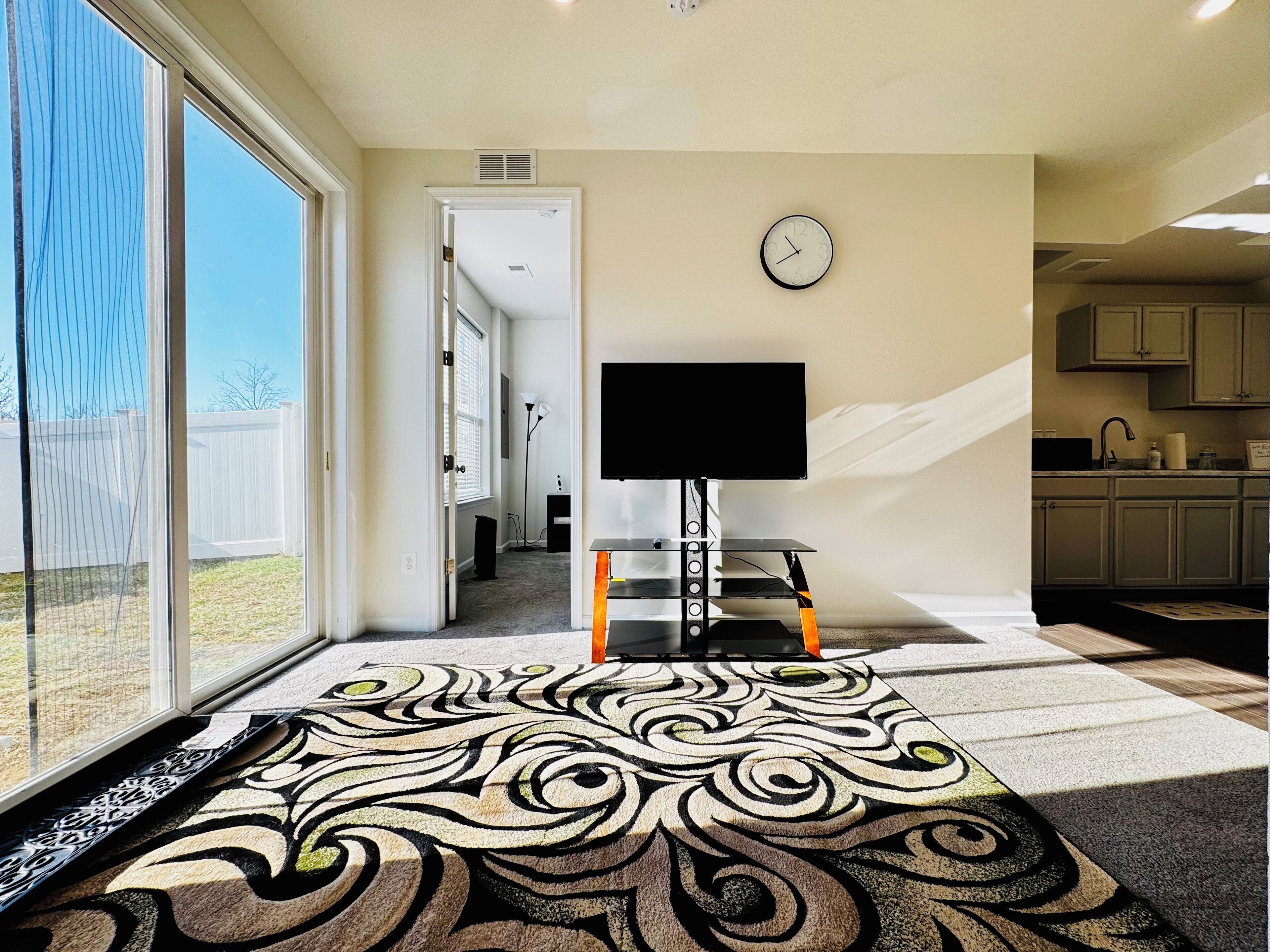 We have just completed the renovation of the main area of the basement just on other side of this efficiency. It has a large room, about 600 sq. ft with a cozy sitting area for watching the new 65" TV and/or the wood stove (used only in winter months = December - March). This is where the pool table is too.