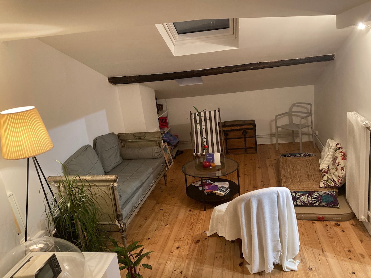 Warm woody loft in a safe area 10mn from the métro station "Mairie des Lilas" ;which is 16 mn from the metro station "chatelet" the center of Paris, 10 mn from the RER station Saint Denis stadium.